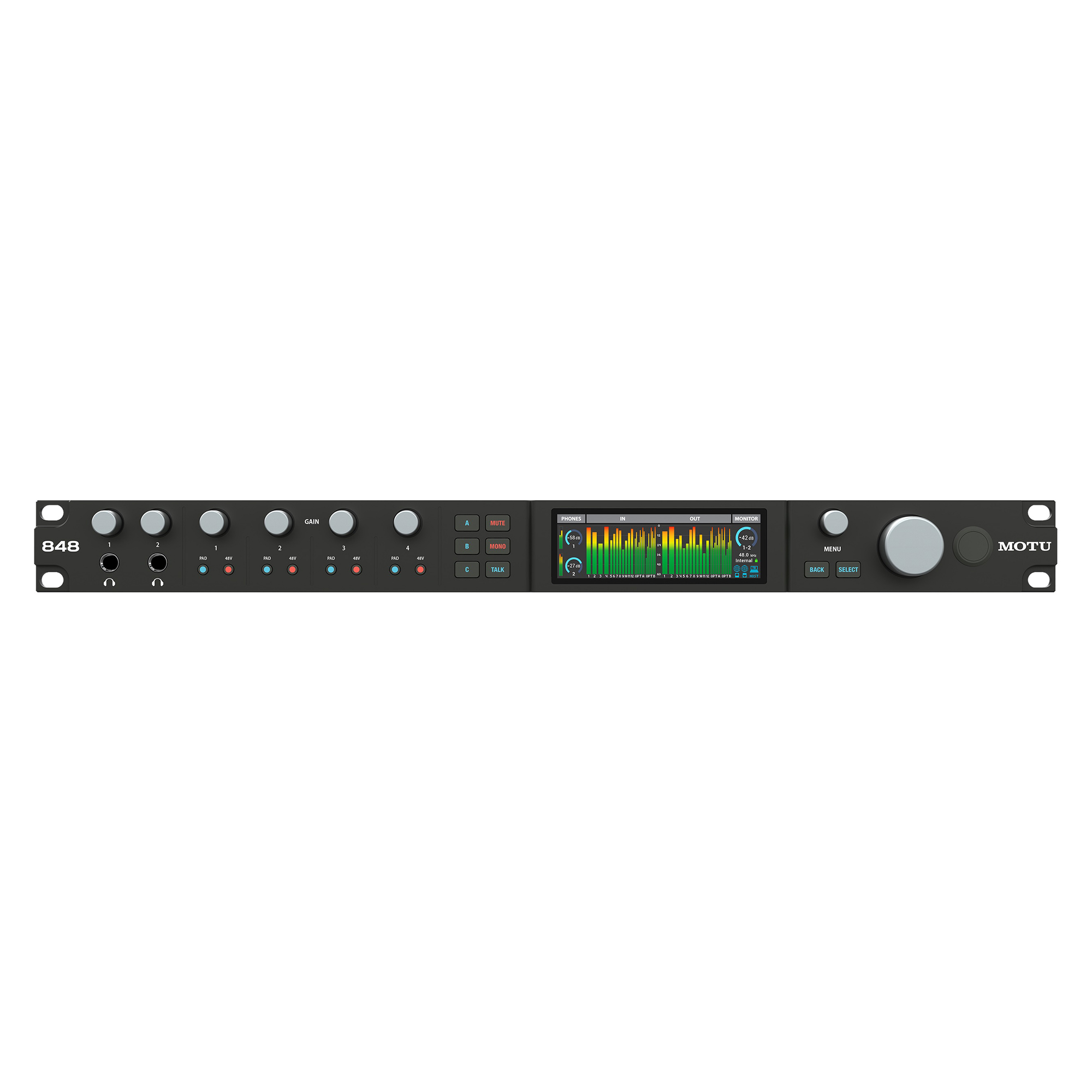 MOTU 848 — это флагманский аудиоинтерфейс нового поколения, предлагающий профессиональную производительность в рэковом формате 1U. Это первое в индустрии устройство, объединяющее технологии Thunderbolt 4, USB4 и сетевой протокол AVB/TSN для обеспечения экстремально низкой задержки и гибкой масштабируемости.