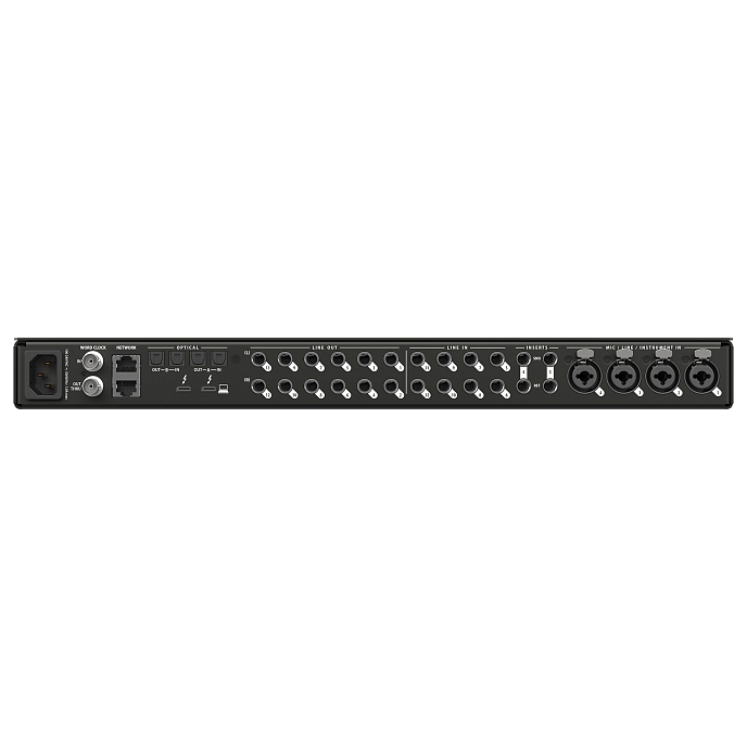 Задняя сторона звуковой карты оснащена четырьмя микрофонными/линейными/инструментальными комбинированными разъёмами XLR/TRS, восемью линейными TRS входами, двумя SEND и двумя RETURN разъёмами на каналах 3 и 4. Другие коммутационные возможности включают 12 линейных TRS выходов; два независимых TRS выхода для наушников; четыре порта Toslink (16 каналов цифровых входов/выходов через ADAT), где первая пара может быть переключена на работу в роли стерео-входа/выхода S/PDIF; пару BNC-разъёмов Word Clock; два порта Ethernet (в том числе, для подключения устройства к сети AVB и использования до 128 каналов AoIP). Стоит отметить, что аналоговые выходы задействуют ЦАП ESS Sabre32, обеспечивая динамический диапазон 125 дБ с показателем кг + шум -114 дБ, а также имеют связь по постоянному току, что позволяет использовать их для передачи CV сигналов.
