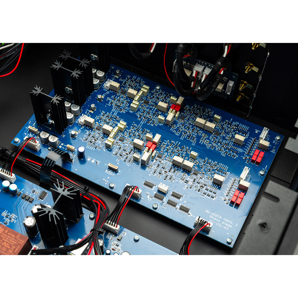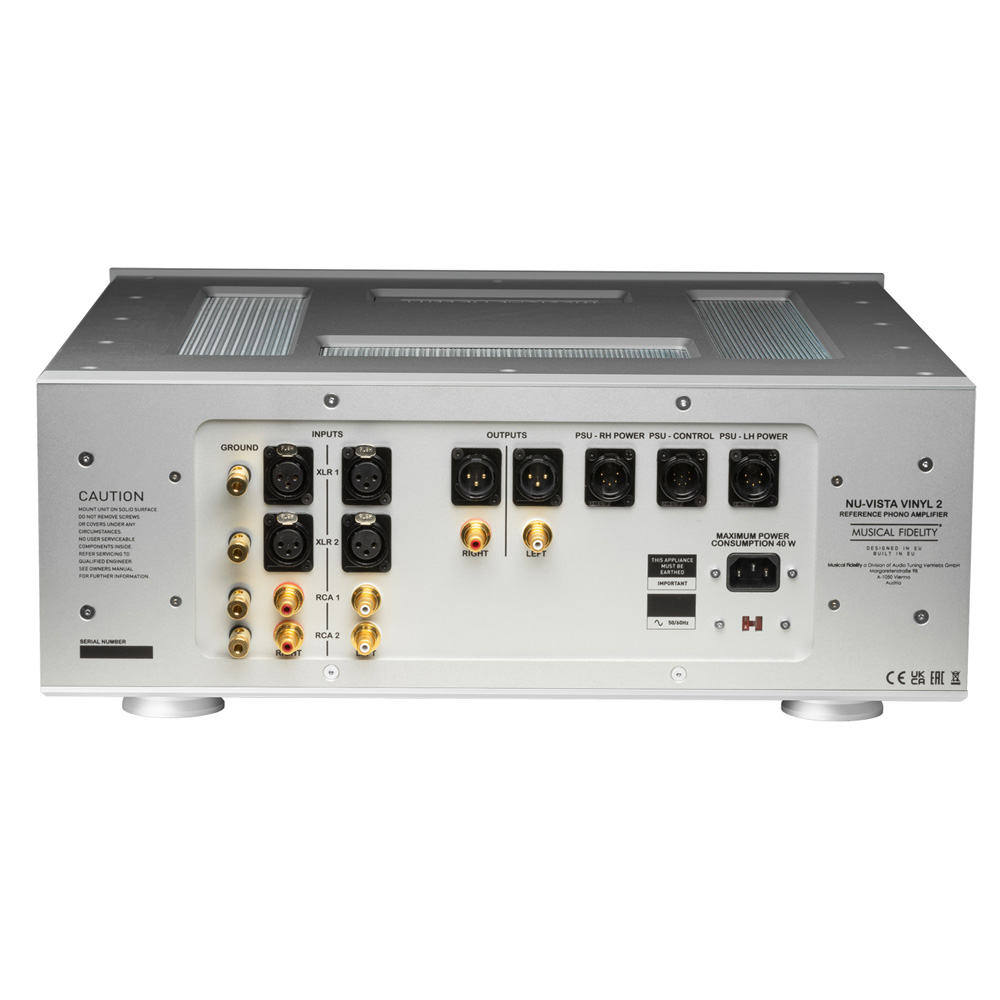 В дополнение к стандартной кривой RIAA Musical Fidelity также внедрили две менее распространенные кривые DECCA и COLOMBIA. Аудиосигналы от фонокорректора поступают на отдельную плату для каждого канала с полностью балансным дискретным каскадом Nuvistor класса А. Чистая компоновка печатной платы и целенаправленный дизайн гарантируют минимально возможный уровень шума и искажений при низком выходном импедансе. Выходы RCA и XLR имеют свои отдельные каскады, что позволяет использовать их одновременно. В Nu-Vista Vinyl 2 используется та же технология отображения и обновленная передняя панель, что и во всех других последних дополнениях Nu-Vista.