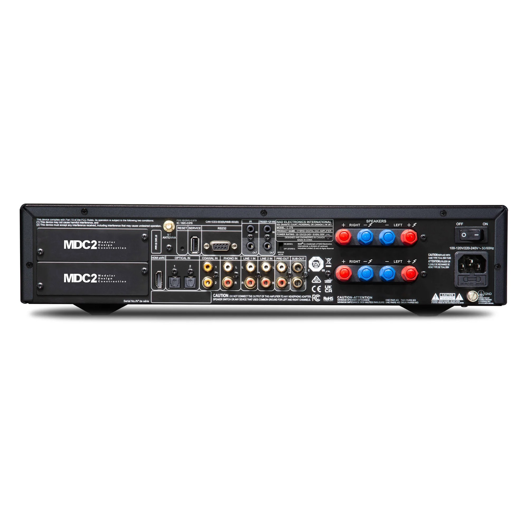 Аппарат оснащен хорошим набором подключений, позволяющим ему стать центром современной стереосистемы. На его задней панели находятся вход для MM-звукоснимателя проигрывателя винила, два линейных входа. NAD C379 имеет и современную цифровую секцию на базе ЦАП ES9028, обладающего низким показателем джиттера и совместимым с новыми форматами аудио High resolution. В усилителе есть два оптических и два коаксиальных входа, а также разъем HDMI. Этот интерфейс можно использовать для подключения к ТВ и прослушивания звукового сопровождения кинофильмов (есть поддержка возвратного аудиоканала eARC) или для сетевых устройств типа Chromecast. Удобное соединение с мобильными гаджетами обеспечивается через Bluetooth с поддержкой aptX HD. Для расширения системы на базе NAD C379 есть выход с предусилителя и два разъема для подключения сабвуферов.