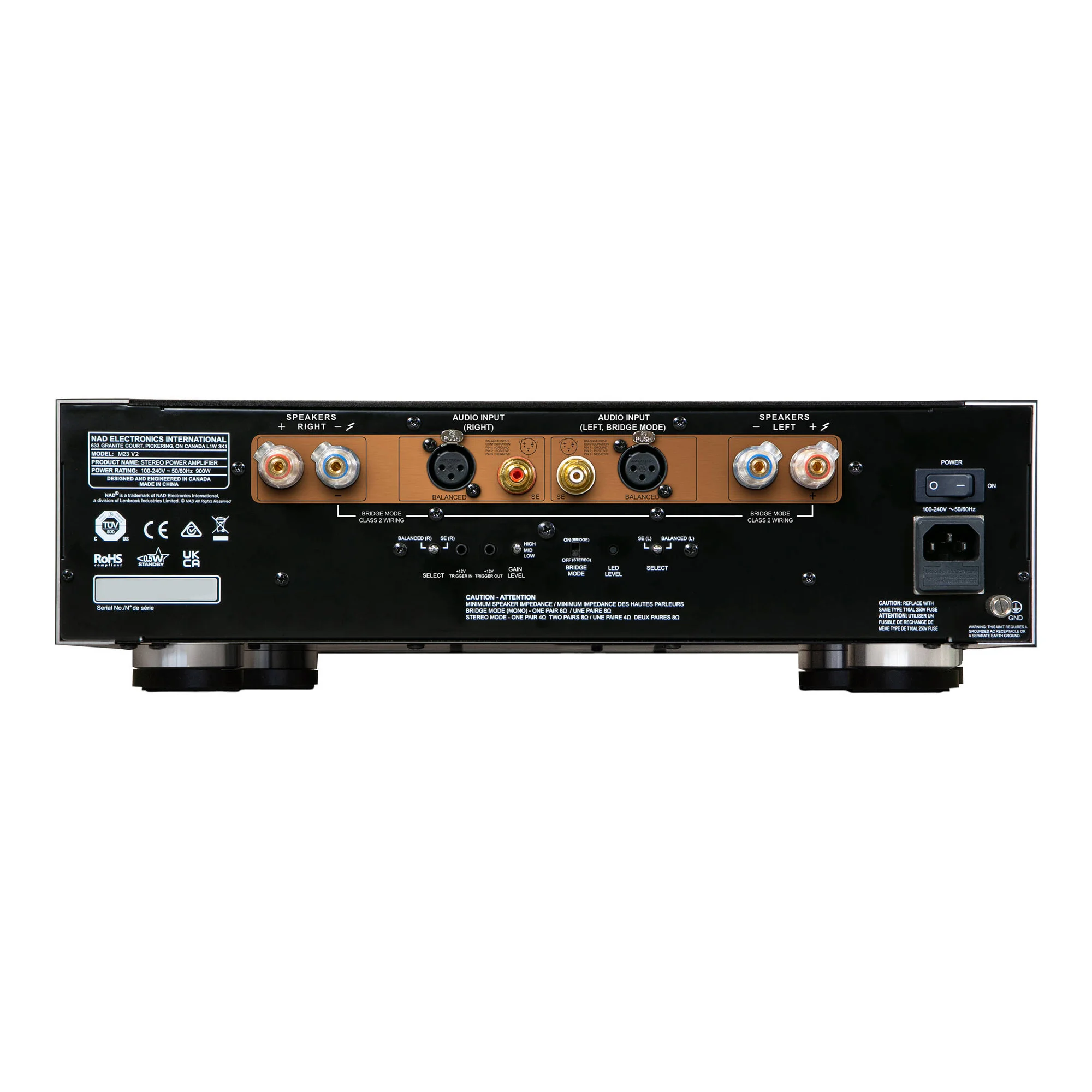 Оснащенный односторонним RCA и балансным XLR входами с автоматической настройкой, трехпозиционным переключателем усиления и 12-вольтовым триггерным входом, гибридно-цифровой стереоусилитель мощности NAD Masters M23 может быть легко интегрирован в высокопроизводительную раздельную систему. Два усилителя M23, работающие в мостовом режиме, могут быть объединены в пару, каждый из которых выдает 700 Вт непрерывной мощности на нагрузку 8 Ом. Усилитель M23 также может работать в паре с отмеченным наградами потоковым усилителем NAD Masters M33 BluOS . Когда два усилителя Eigentakt™ работают в мостовом режиме, комбинация M33/M23 обеспечивает ошеломляюще мощную непрерывную мощность 700 Вт/сек.