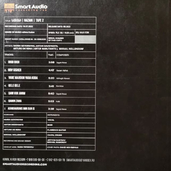 Издание NAZANI особенно органично существует именно на ленте: традиционные инструменты, вокальные интонации и медитативная протяжённость армянских мелодий раскрываются здесь шире, чем в цифровом формате. Лёгкая компрессия, естественная насыщенность средних частот и живое дыхание записи создают ощущение времени, пространства и присутствия - эффект, ради которого коллекционеры охотятся за подобными релизами.