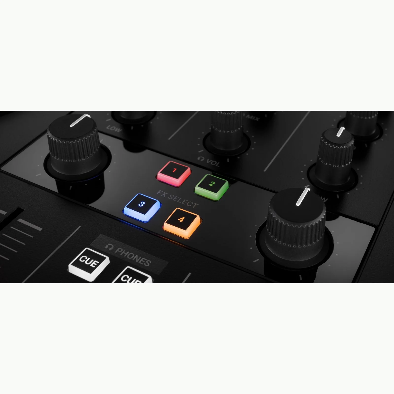 В секции микшера располагаются 3-полосные эквалайзеры для каждой деки, кнопки активации микрофона и включения функции квантизации, а также регуляторы гейна, громкости в наушниках и общего уровня. В наличии теперь имеются четыре клавиши для включения восьми новых эффектов из программы TRAKTOR, среди которых есть ревербератор, два дилэя, флэнжер, бит-крашер и несколько других. Наконец, присутствуют 6-сегментная индикация выходного уровня, способная сообщить о перегрузке, а также прочный кроссфейдер, рассчитанный на многолетнее использование.