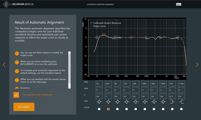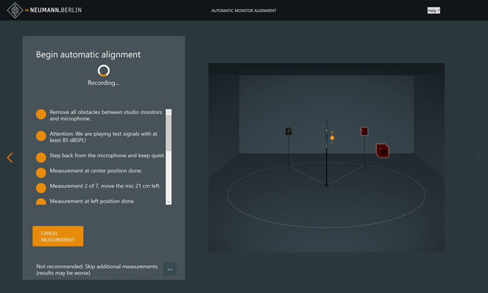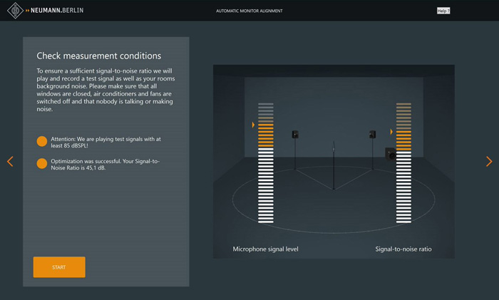 Автоматическая юстировка Neumann это специальный инструмент для мониторных стереосистем KH 80 DSP с сабвуфером KH 750 DSP или без него, а также двух мониторов линейки KH без DSP подключенных к аналоговым выходам сабвуфера KH 750 DSP. В отличии от обычных программ для акустической коррекции это интегрированное решение с новыми алгоритмами специально разработано для студийных мониторов Neumann. Не нужны дополнительные модули или специальные аудио драйверы: данные обрабатываются и хранятся в чипах DSP самих мониторов. В качестве уникального преимущества, программа не только оптимизирует амплитудную характеристику, но и фазу. Это приводит к высочайшей точности воспроизведения тональности и импульсов.