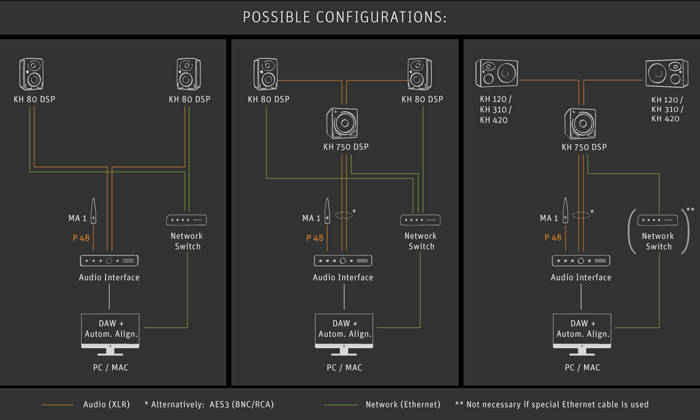 - 1 пара громкоговорителей KH DSP или 1 сабвуфер KH 750 DSP в сочетании с парой аналоговых (не DSP) громкоговорителей KH;