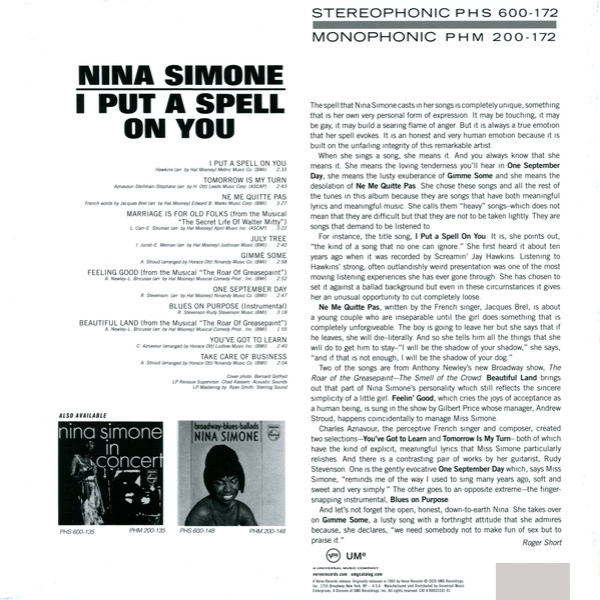Запись знаменита тем, что Simone взяла уже известный хит “I Put A Spell On You”, написанный Screamin’ Jay Hawkins, и преобразила его добавив драматизма, страсти и чувственности, которые стали её фирменным художественным почерком.