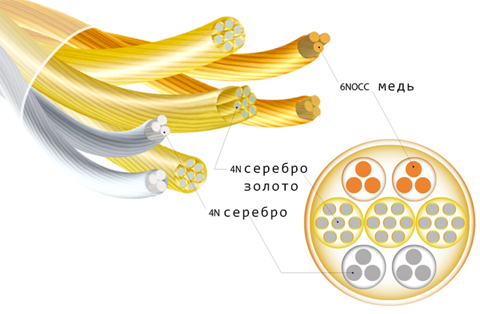 - проводник из 4N серебра + 4N серебра с добавлением золота и 6N медного сердечника;