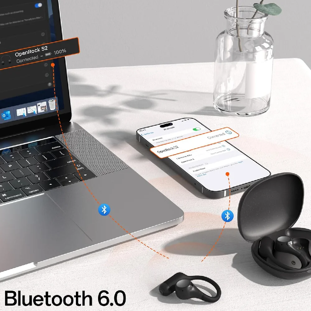 OpenRock S2 выполнены с использованием титановых волокон толщиной 0,6 мм и мягкого жидкого силикона, что делает их вес почти невесомым - всего 7 граммов. Инновационная форма с заушным крючком-зажимом обеспечивает плотное, но ненавязчивое прилегание, исключая дискомфорт даже при длительном ношении.