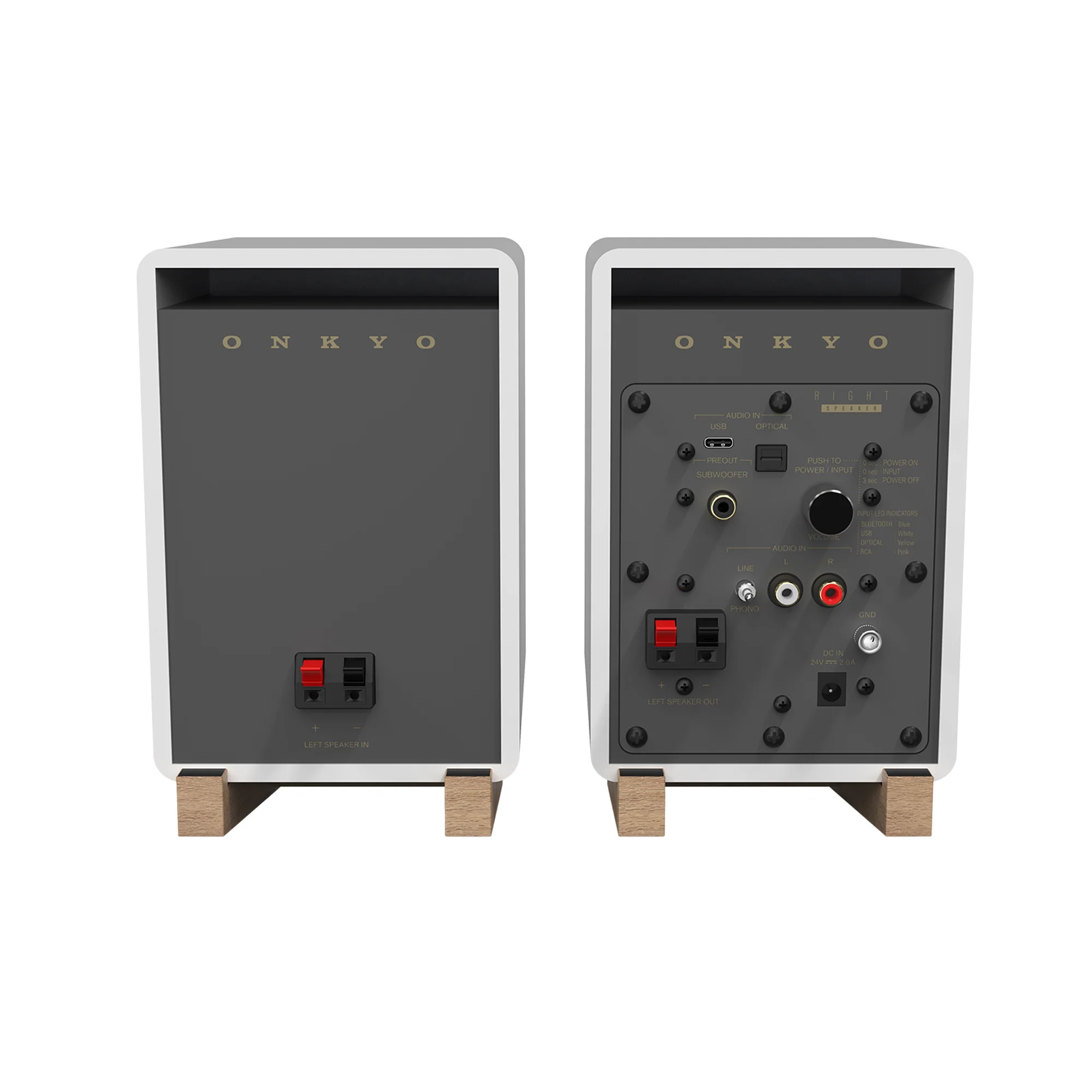 Onkyo GX-10DB – 2-полосные компактные активные полочные акустические системы с фазоинвертором, с Bluetooth 5.3 и входами для проводной коммутации, пультом ДУ и специальными подставками-основаниями для наилучшего воспроизведения. Колонки относятся к серии Creator, разработанной в первую очередь для создателей контента, удаленно работающих профессионалов и заядлых геймеров.