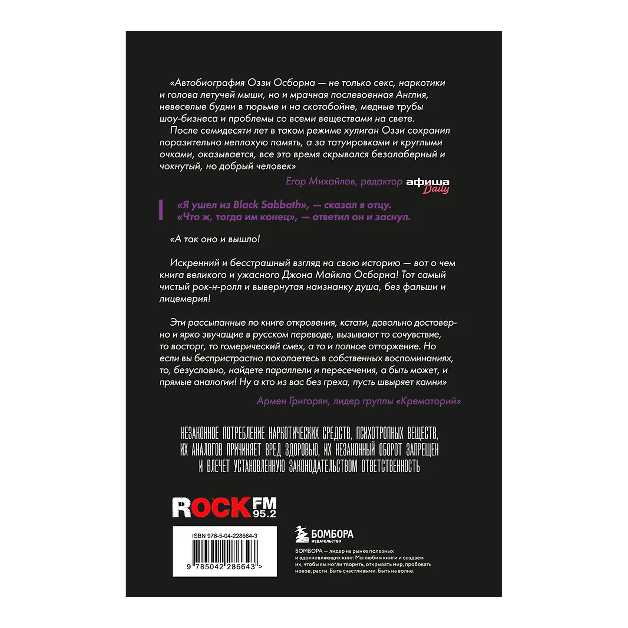 Но история жизни и пути к славе одного из самых известных музыкантов планеты не идет ни в какое сравнение с его воспоминаниями о них. Каким бы зловещим Оззи ни казался на сцене, его острое чувство юмора и самоирония делают эту автобиографию настоящим кладом для любого ценителя рок-музыки.
