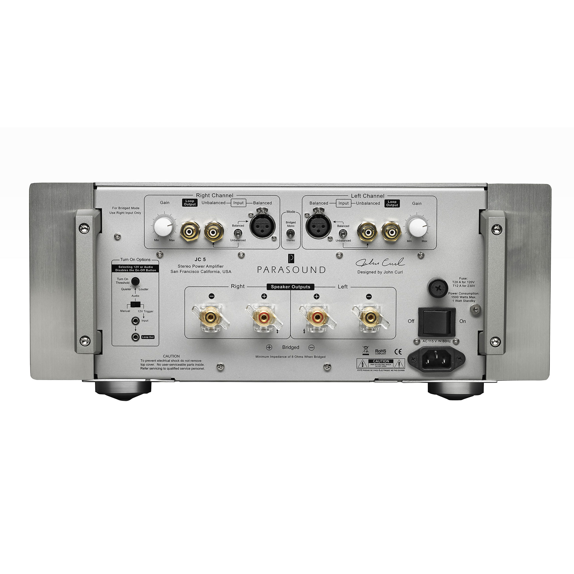 Одной из особенностей фирменных усилителей мощности Parasound является высокий демпинг-фактор — показатель, напрямую характеризующий способность усилителя справляться со сложной нагрузкой и отрабатывать динамические моменты. В то время как у большинства домашних усилителей класса АВ показатель демпинг-фактора порядка 100 единиц уже считается неплохим показателем, у модели Parasound JC 5 он составляет 1000. Поэтому до появления усилителей класса D конкурентов у Parasound было крайне мало, впрочем, и сейчас ему могут позавидовать многие.