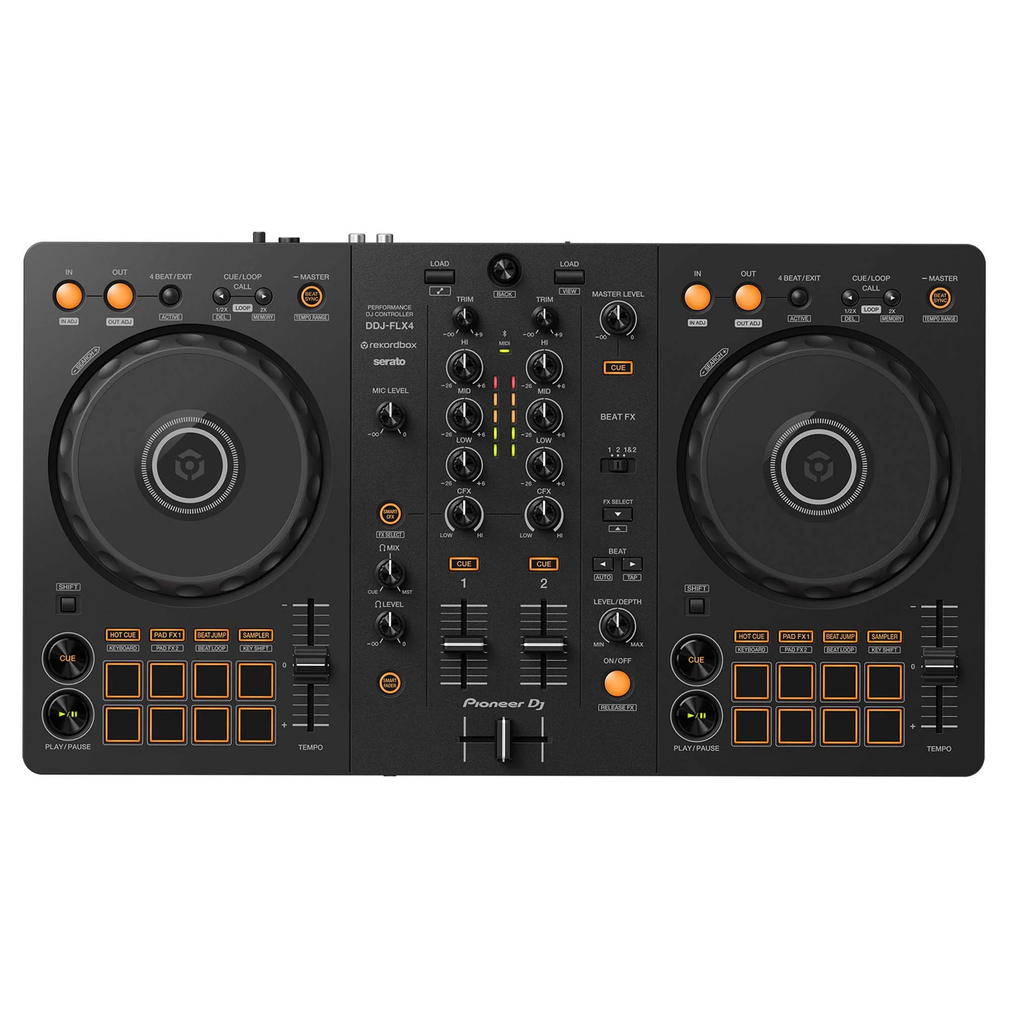 DDJ-FLX4 — доступная модель, унаследовавшая ключевые черты профессиональных контроллеров линейки Pioneer DJ. Она отличается удобным дизайном, что облегчает обучение диджеингу. Существует множество диджейских программ для микширования музыки, включая бесплатное использование режима Performance в rekordbox для Mac/Windows. Программа rekordbox работает с рядом потоковых платформ. Это дает вам возможность выбирать из миллионов треков, доступных на Beatport Streaming и Beatsource Streaming (требуется подписка), и микшировать их вместе на DDJ-FLX4