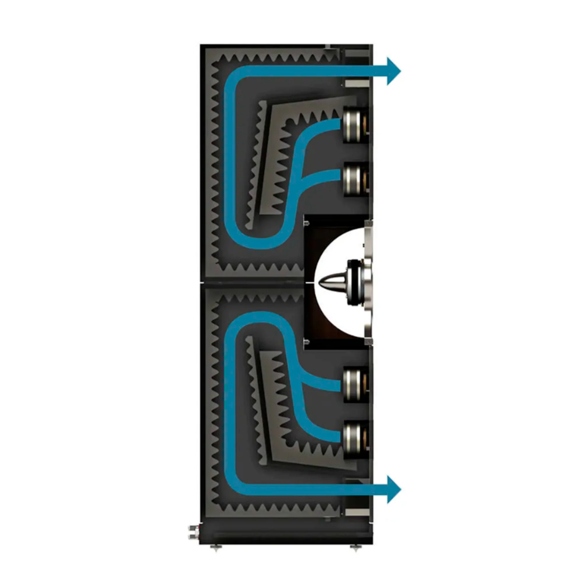 В кабинет установлено четыре 165-миллиметровых НЧ-динамика с диффузорами из плетеного углеволокна. Реализация технологии ATL выражается в оснащении каждой колонки двумя 2,4-метровыми лабиринтами с перегородками, обитыми звукоизолирующим материалом, обеспечивающим чистое и реалистичное звучание басов.