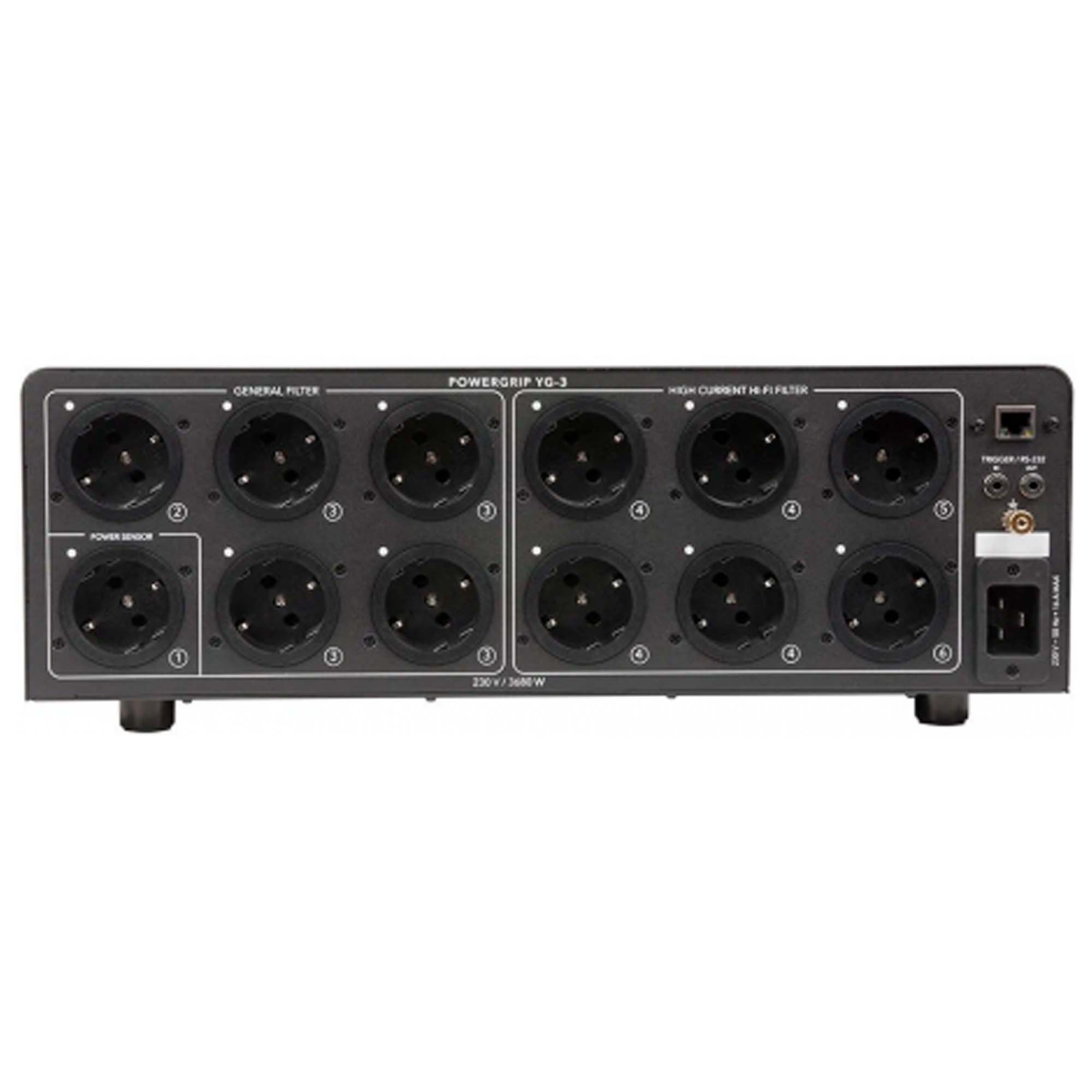 Фильтр оснащен 12-розетками, разделенными на шесть групп для независимого управления включением подсоединенных устройств. Также в Powergrip YG-3 имеются два вида фильтров. Один из них работает на шесть розеток, предназначенных для подключения обычных устройств с импульсными блоками питания, к другому же, рассчитанному на большой ток нагрузки, подключаются усилители и мощная AV-техника. Максимальный ток нагрузки для Powergrip YG-3 составляет 25 А, что соответствует 5750 Вт потребляемой мощности.