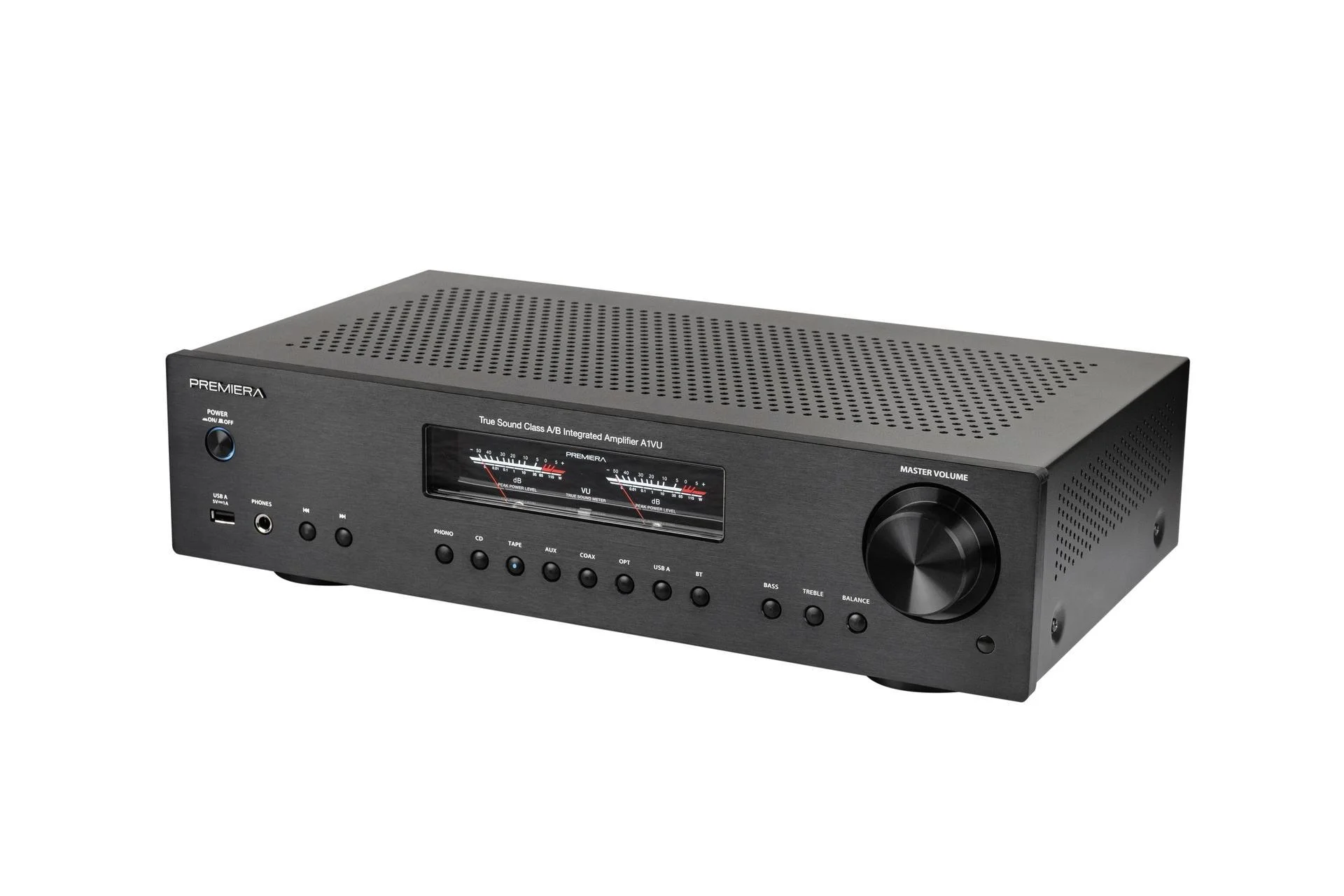 Premiera A1VU – интегральный Hi-Fi стереоусилитель класса AB со встроенными ММ-фонокорректором, ЦАП, USB, Bluetooth, стрелочными VU-индикаторами, с номинальной выходной мощностью 51 Вт на канал (8 Ом), с возможностью подключения восьми источников входного сигнала и тремя аналоговыми выходами – два стерео (для записи и для наушников) и один моно (для активного сабвуфера).