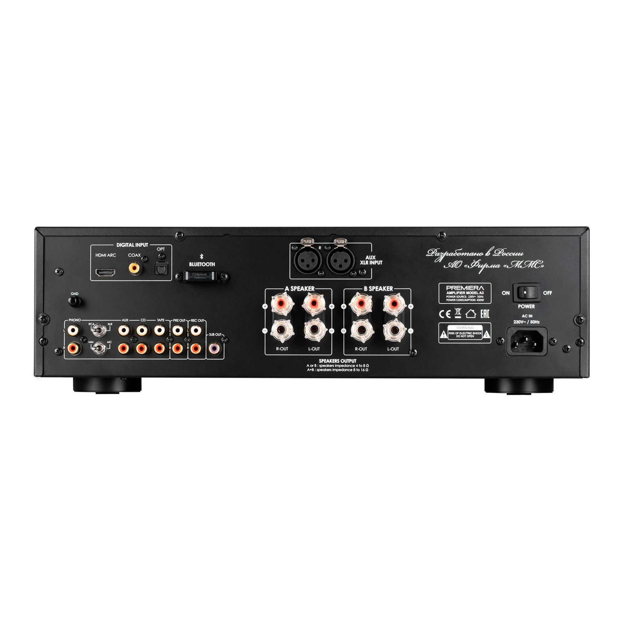 Premiera A3 – классический интегральный стереоусилитель класса AB со встроенными ММ/МС-фонокорректором, ЦАП, Bluetooth aptX, HDMI ARC и с номинальной выходной мощностью 110 Вт на канал (8 Ом).