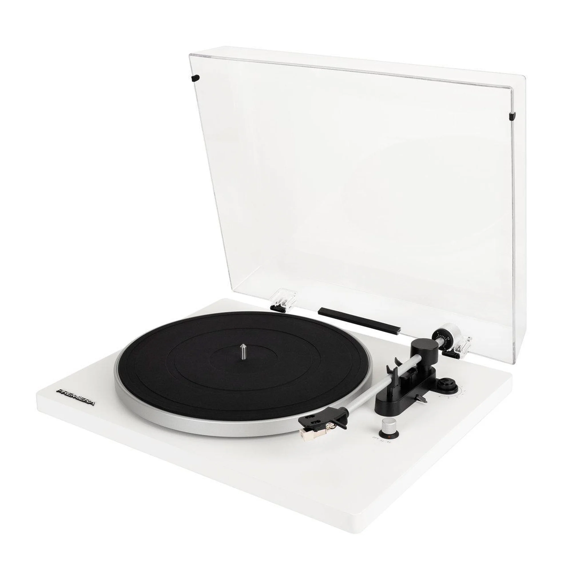 Бесшумный серводвигатель постоянного тока обеспечивает вращение опорного диска с помощью пассикового привода. ECO ONE комплектуется ММ-картриджем Audio-Technica AT-AT3600L с конической заточкой иглы. От пыли проигрыватель защищает прозрачная крышка, что редко встречается и на более дорогих моделях.