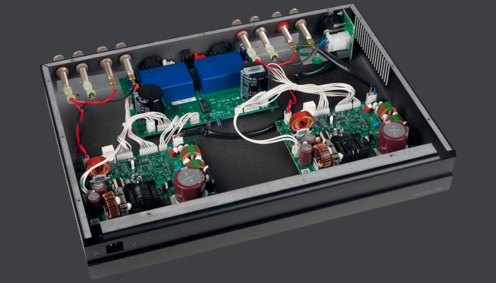 - «двойного моно» — каждый канал построен на собственной плате, имеет отдельный блок питания и, соответственно, остается полностью независимым;