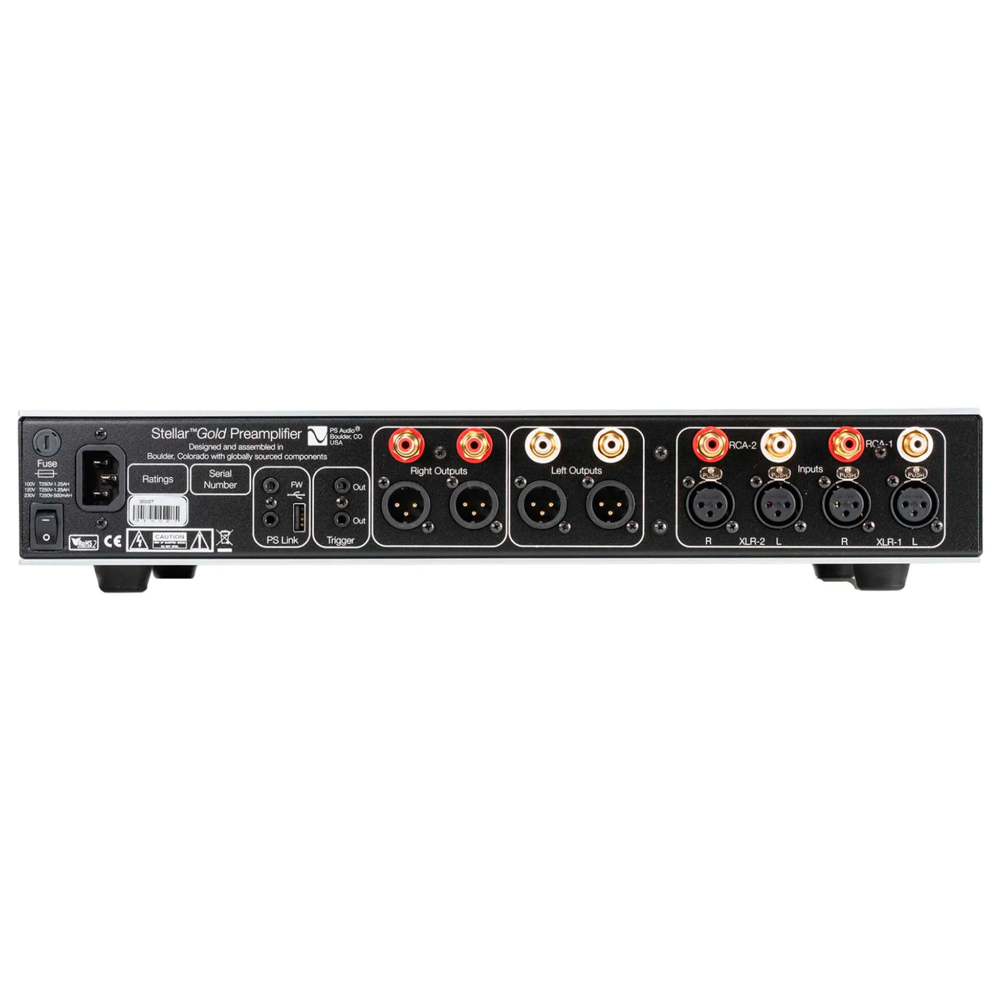 В PS Audio StellarGold Preamplifier используются 4 идентичных балансных и обычных входов, и он преобразует все входные сигналы в балансные для минимизации искажений и помех. StellarGold может быть использован как в 2-канальных аудио системах, так и в домашних кинотеатрах.