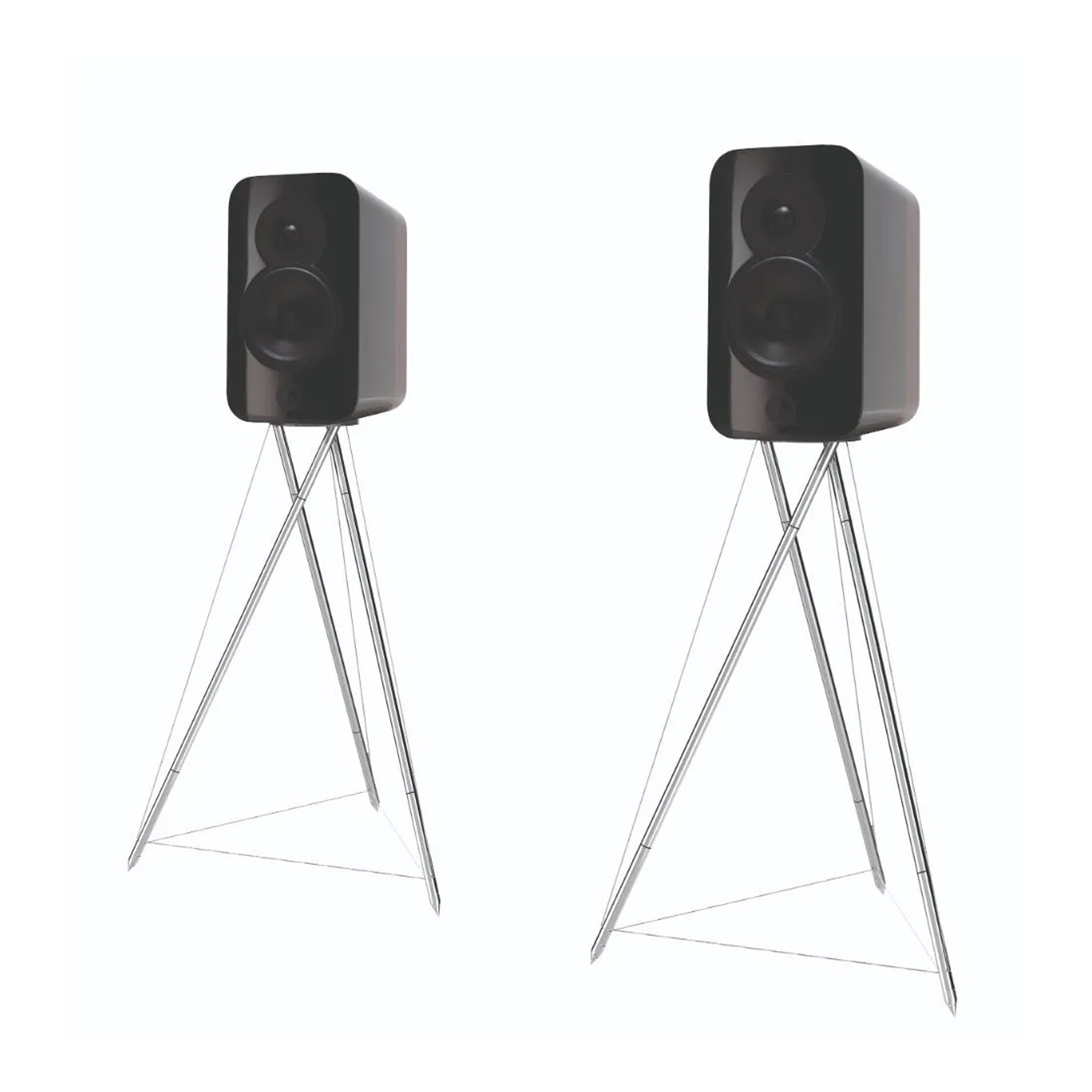 Стойка состоит из трех стальных труб, соединенных стальными же тросами. Ее назначение — максимально изолировать акустику от нежелательных вибраций. Этому способствует небольшая площадь соприкосновения стойки с полом — всего в трех точках. Тренога крепится с помощью системы пружинных подвесов к площадке из упругого полимера Sylodamp, и на площадку уже через четыре небольшие проставки ставится колонка. По словам Q Acoustics, такая стойка позволяет получить более ощутимый бас и более широкую сцену.