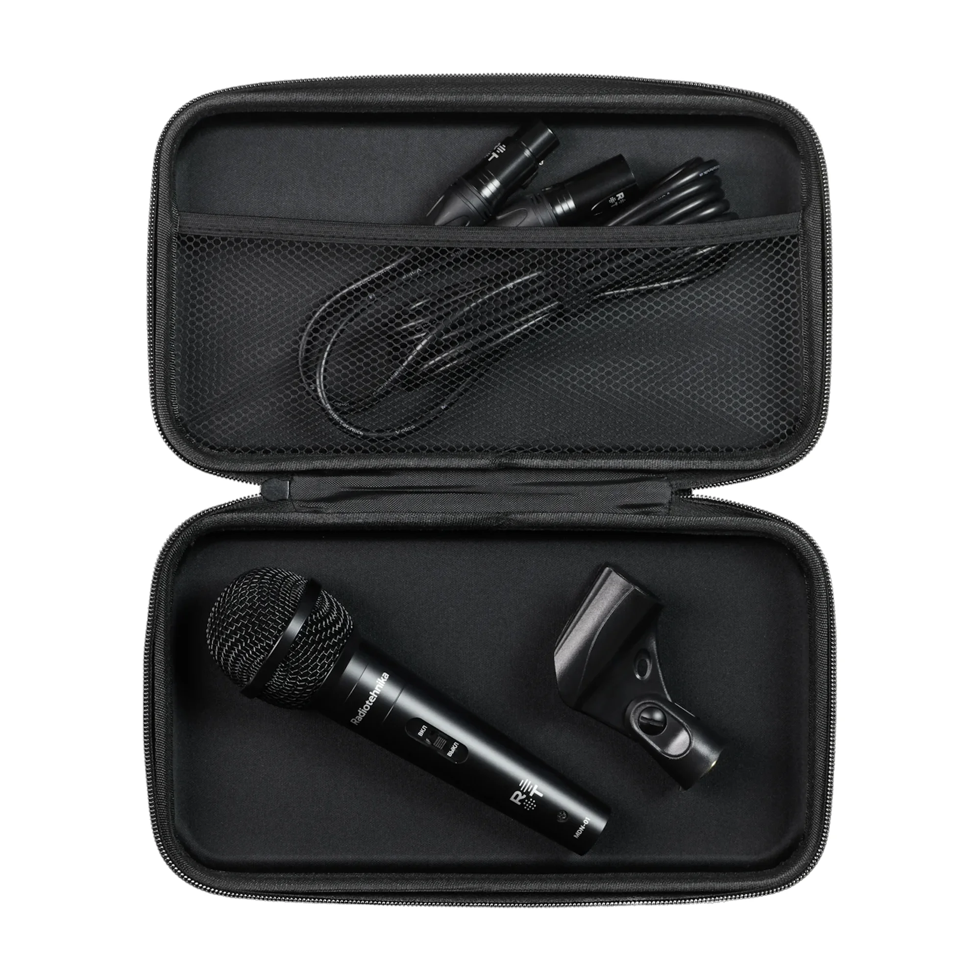 Принимая во внимание рабочую специфику MDN-01, разработчики не забыли самое главное— компактность и удобство хранения. В комплекте идет надежный и удобный кейс, в котором, помимо самого микрофона, хранятся кабель XLR-XLR длиной 4 метра, держатель микрофона и универсальный резьбовой адаптер.