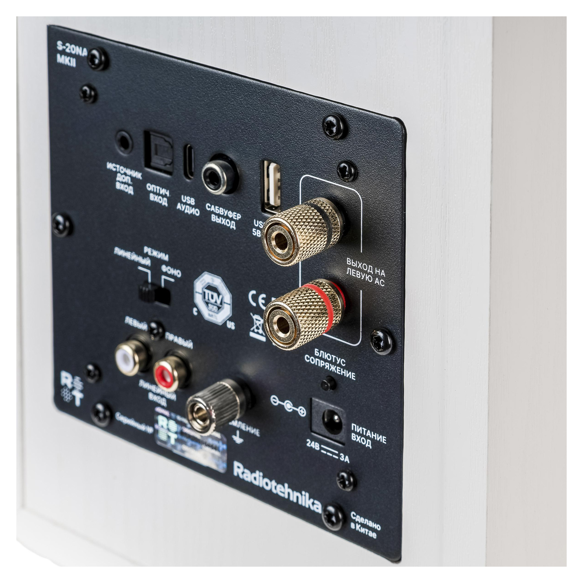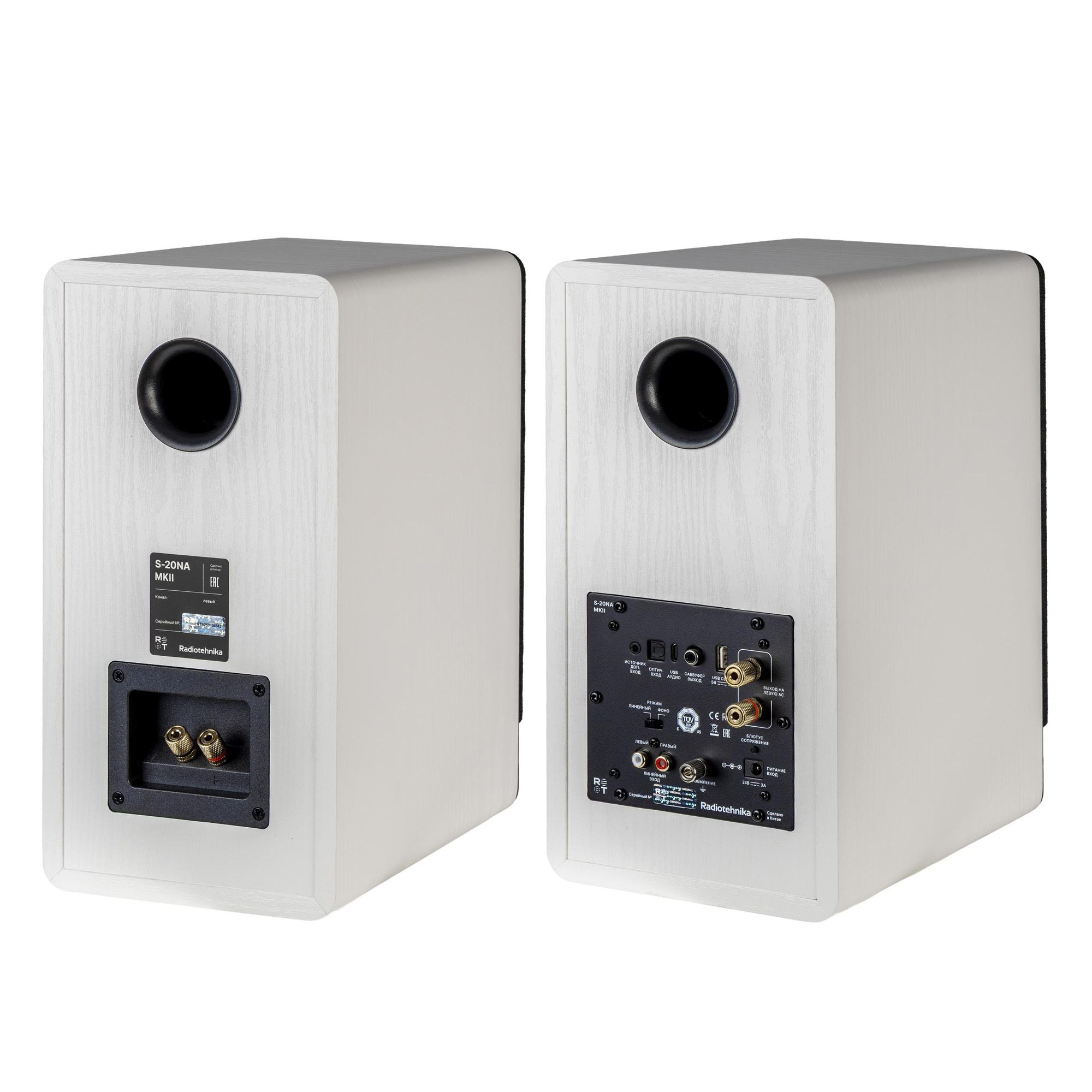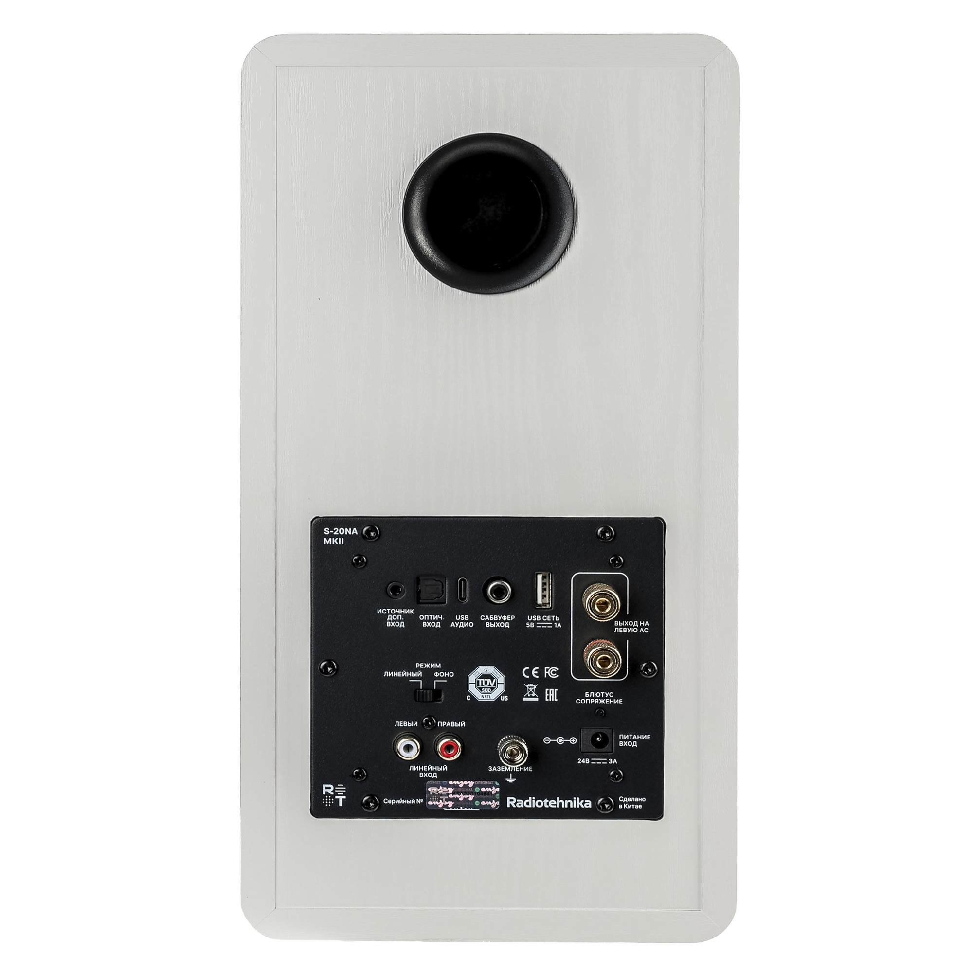 В 133-мм низкочастотном динамике установлен диффузор из композита Polyglass на основе бумаги и стекла. Диафрагма получилась легкой и жесткой, а подвес из искусственной резины обеспечивает ее линейное перемещение с большой амплитудой. В модели Radiotehnika S-20NA MK2 есть вход USB-C, оптический цифровой и аналоговые входы на разъемах mini-jack 3.5 мм и RCA.