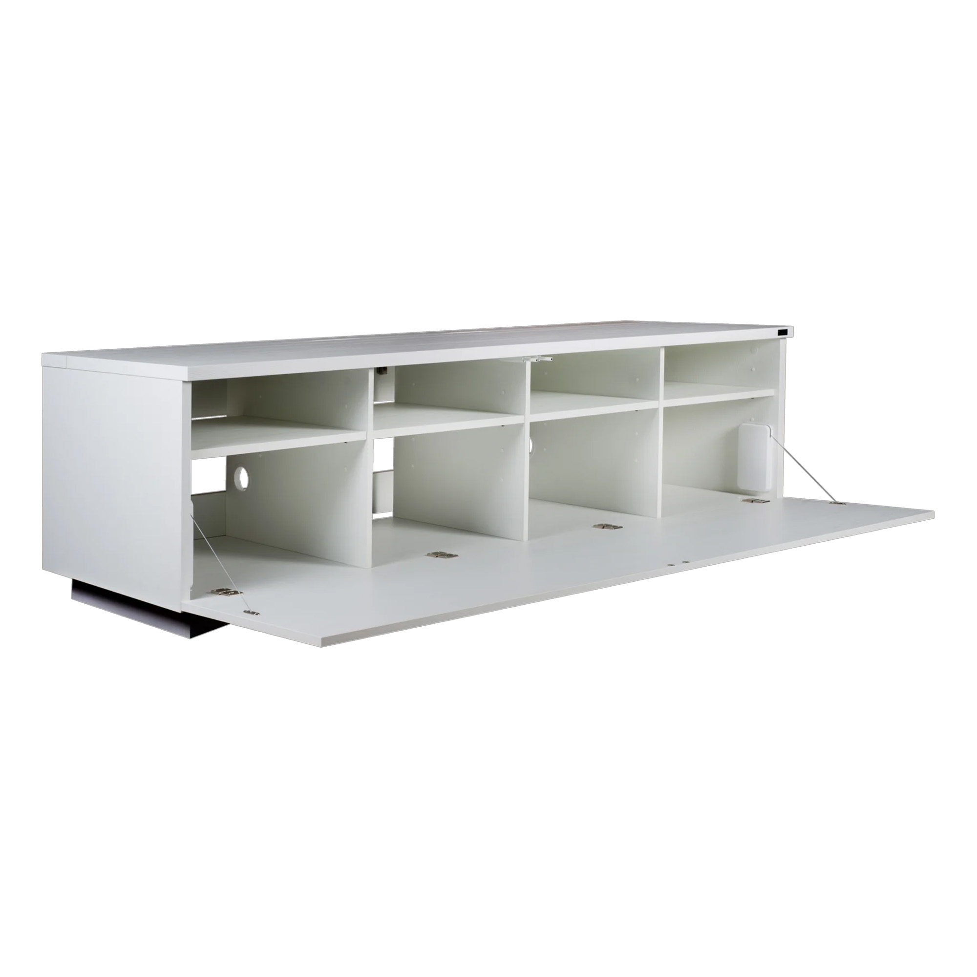 Тумба состоит из восьми отсеков, в которых с комфортом можно разместить даже крупные Hi-Fi-компоненты и ресиверы. Полки регулируются по высоте (три положения), что позволяет адаптировать внутреннее пространство под индивидуальные потребности. Верхняя панель рассчитана на установку телевизора, проигрывателя или центрального канала системы.