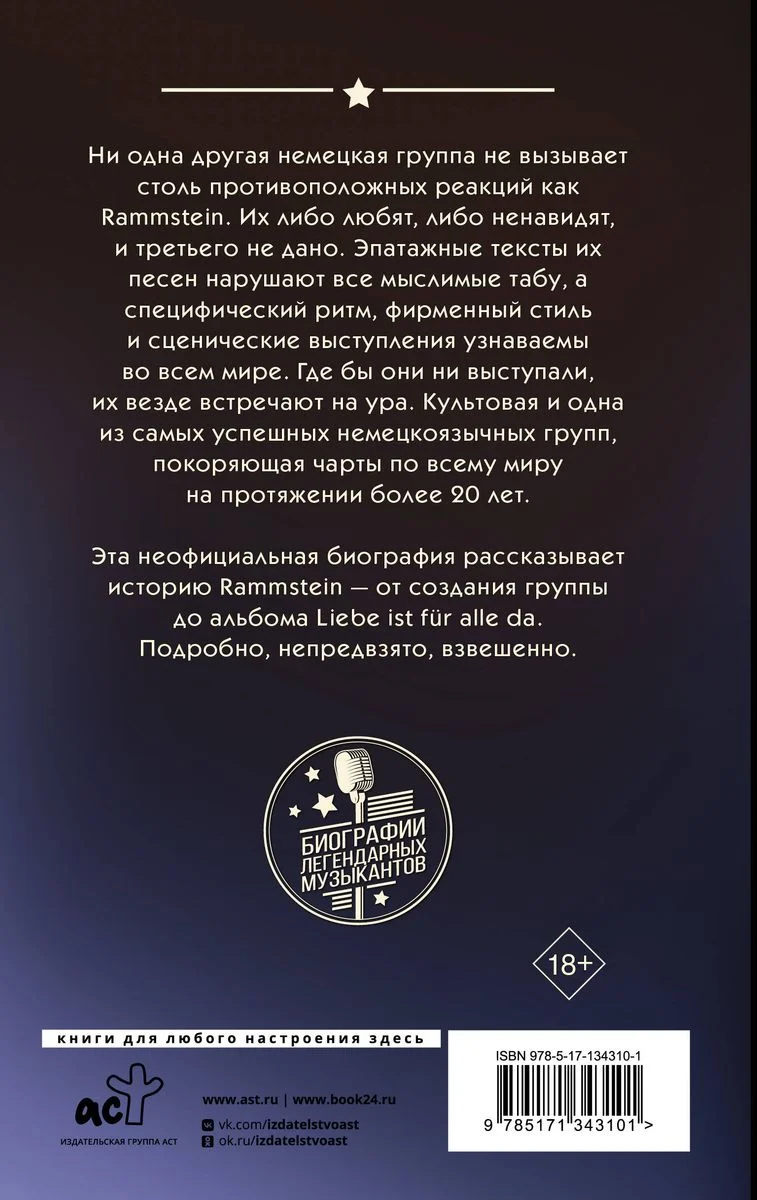 Где бы они ни выступали, их везде встречают на ура. Культовая и одна из самых успешных немецкоязычных групп, покоряющая чарты по всему миру на протяжении более 20 лет. Эта неофициальная биография рассказывает историю Rammstein — от создания группы до альбома Liebe ist fur alle da. Подробно, непредвзято, взвешенно.