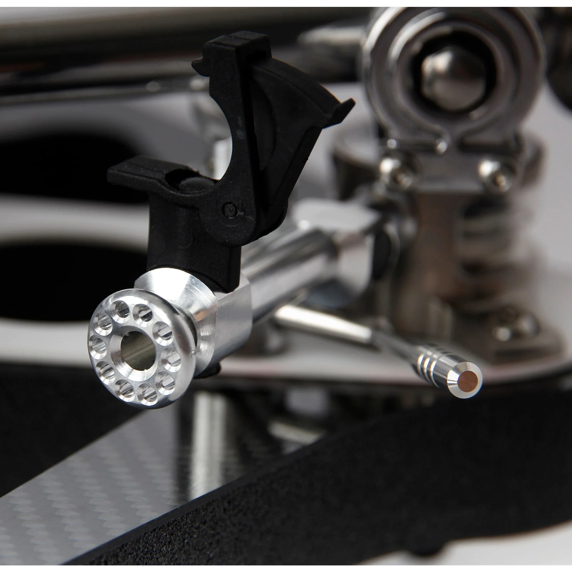 Тонарм RB Titanium — самый совершенный и точный тонарм Rega. Вся конструкция тонарма спроектирована таким образом, чтобы иметь минимум механических соединений при использовании самых жестких материалов во всех критических зонах. RB Titanium обеспечивает перемещение практически без трения по горизонтали и вертикали, при этом отсутствует измеримый свободный ход в узлах подшипников. В RB Titanium используется новый цельный титановый корпус вертикального подшипника и титановый узел вертикального шпинделя. Рекомендуемая головка звукоснимателя Rega Aphelion 2 MC устанавливается на цельной алюминиевой трубке, отполированной вручную, чтобы максимально снизить массу. Конструкция дополнена вольфрамовым валом балансира и противовесом.