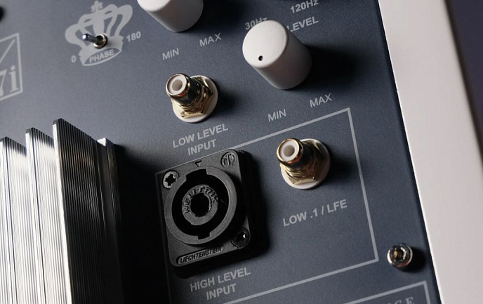 Внешне T7i похож на младшую модель в линейке - он также имеет правильную кубическую форму, его корпус выполнен из толстых ДВП и дополнен внутренними стяжками. Внешняя отделка черным или белым рояльным лаком не только придает сабвуферу привлекательный внешний вид, но и служит для дополнительного демпфирования стенок. Аппарат оснащен усилителем мощностью 200 Вт, который работает в классе A/B, и для охлаждения его выходных каскадов предусмотрен крупный теплоотвод на задней панели. Там же смонтированы входные разъемы, а также органы управления REL T7i. Здесь имеются два низкоуровневых (линейный и LFE) входа на гнездах RCA, а также традиционный для сабвуферов компании высокоуровневый вход (разъем Neutrik Speakon). Для оптимального согласования с основными колонками в случае использования сабвуфера в стереосистеме REL рекомендует именно такой тип соединения. В комплекте с сабвуфером поставляется 10-метровый кабель с разъемом Neutrik.
