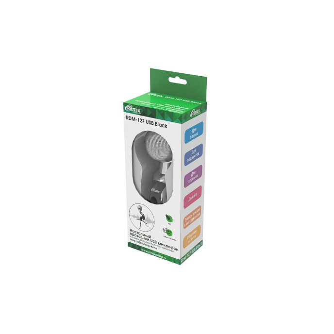 RITMIX RDM-127 отлично подходит для интервью и общения по сети. Работа осуществляется при чувствительности -30 дБ и сопротивлении 2200 Ом. Микрофон оснащен кабелем длиной 1.5 м с USB-разъемом.