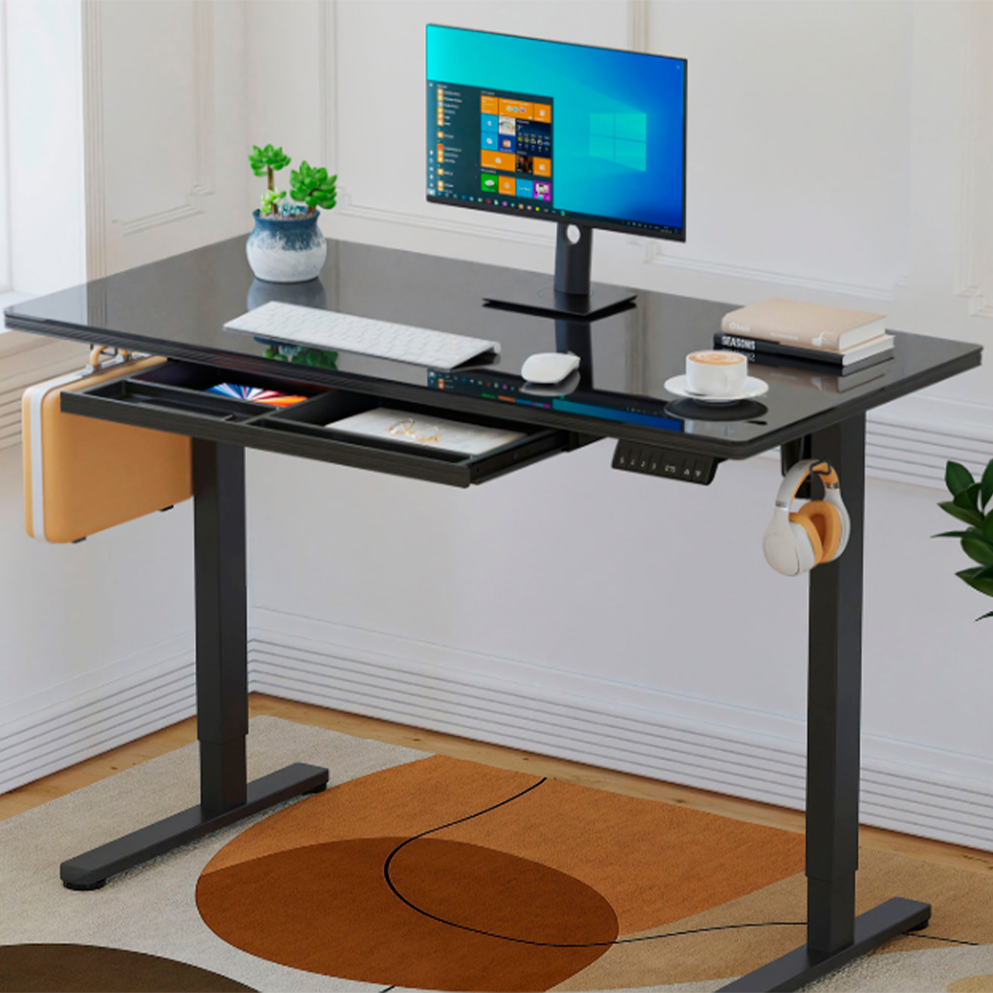 - материал: закаленное стекло и МДФ (столешница), металл (рама и ножки), пластик (ящик, корпус управляющего элемента).