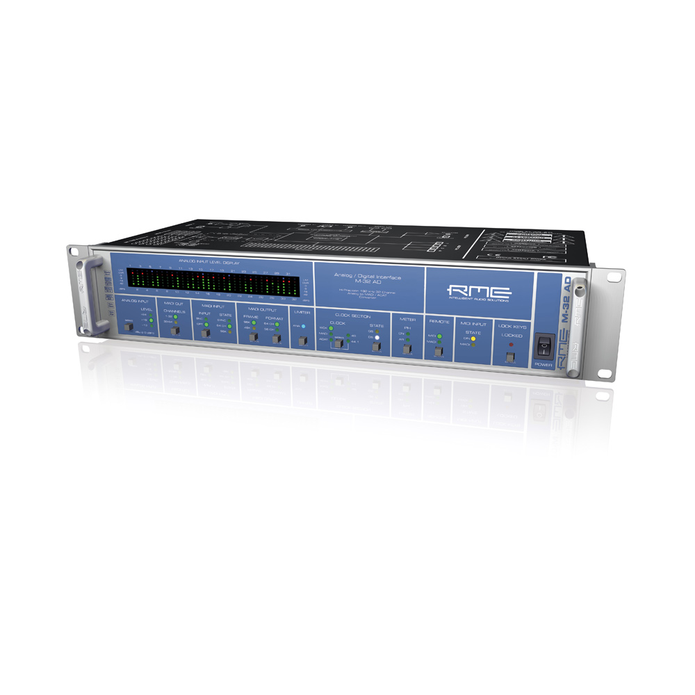 RME M-32 AD 32-х канальный аналого-цифровой конвертер в ADAT/MADI.И без того широкая линейка MADI от RME пополнилась высококлассными 16-ти и 32-х канальными конвертерами. Конвертеры серии М рассчитаны на интеграцию в профессиональные студии, на использование во время живых выступлений, а также на применение в теле- и радиовещании.32-х канальный конвертер M-32 AD осуществляет аналогово-цифровое преобразование сигнала в форматы MADI и ADAT.