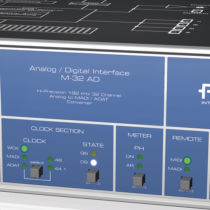 Полностью симметричная аналоговая схема гарантирует отличные характеристики соотношения сигнал/шум и низкий уровень искажения сигнала на различных уровнях. Применение новейших технологий конвертации обеспечивает не только частоту дискретизации до 192 кГц, но и уровень соотношения сигнал/шум равный 116 дБ на всех каналах. Кроме того, новый контроллер обладает функциями лимитера, что обеспечивает эффективную защиту аналогового сигнала от перегрузок. Устройство имеет MADI- и ADAT-входы/выходы, аналоговые входы 6,3 мм (TRS), пульт дистанционного управления MIDI и MIDI над MADI. Устройство может функционировать при различных напряжениях сети. Те же характеристики относятся и конвертеру M-32 DA, который обеспечивает высококлассное 32-х канальное преобразование цифрового сигнала в аналоговый.