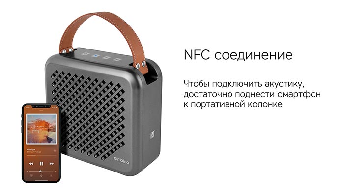 Mysound Chroma совместима со всеми популярными устройствами с поддержкой Bluetooth. Но главная ее особенность - это возможность подключаться к гаджетам при помощи NFC соединения. Достаточно просто поднести смартфон к акустике и он тут же будет сопряжен с колонкой и готов к воспроизведению.