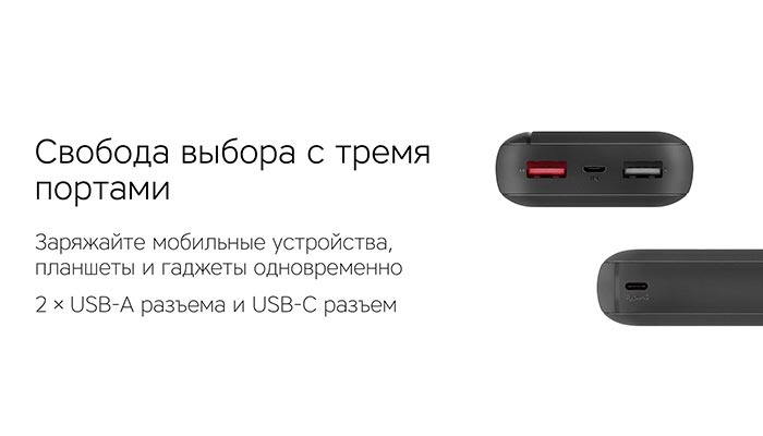 Кроме двух стандартных портов USB-A у внешнего аккумулятора Rombica NEO Mini есть один порт USB-C, что позволяет одновременно заряжать от него три разных устройства, с двумя различными интерфейсами подключения.