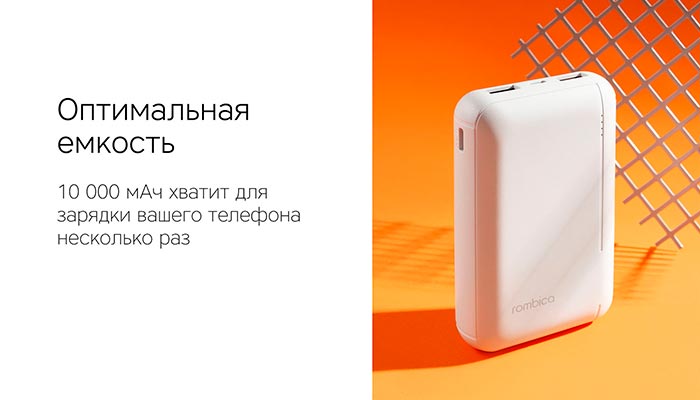Внешний аккумулятор Rombica NEO Mini имеет компактный размер: всего 10 см в длину и 65 см в ширину, и совсем небольшой вес - 226 грамм, благодаря чему ему без труда можно найти место в кармане или сумочке.