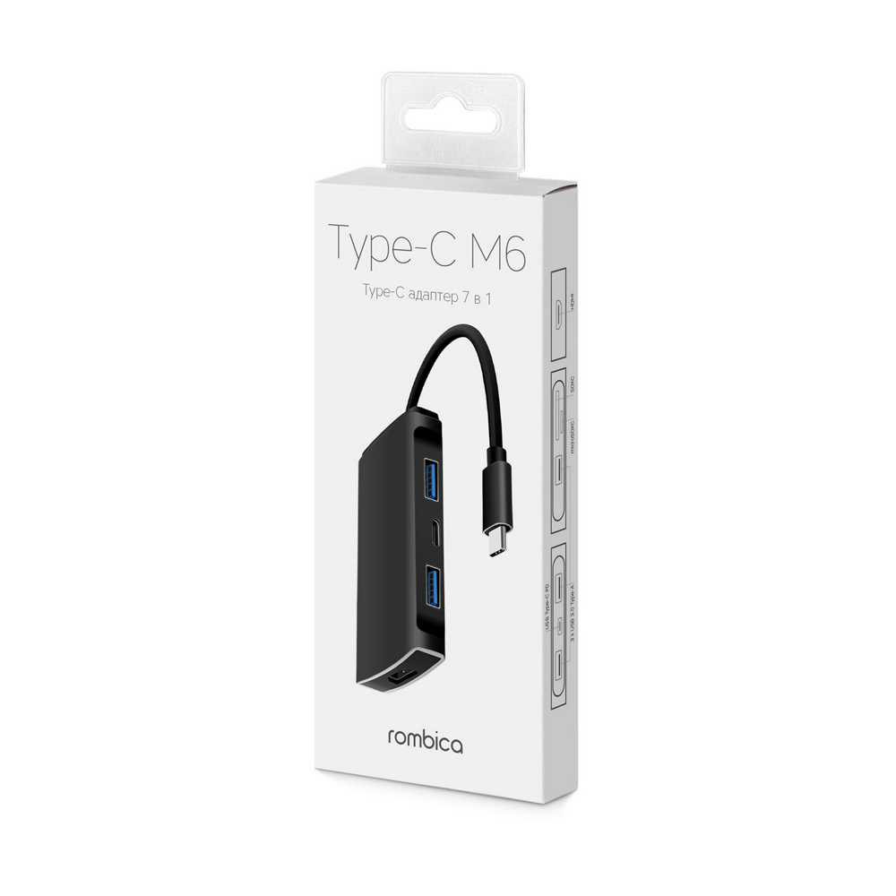 Rombica Type-C M6 оснащена слотом для SD/SDHC/SDXC карт, слотом для microSD/microSDHC/microSDXC карт, интерфейсом USB Type-С с поддержкой Power Delivery до 87 Вт, 3 портами USB 3.0, а также видеовыходом HDMI 4K. Таким образом, вы сможете подключать к устройству монитор, флешки, фотоаппараты. При этом вам не придется производить никаких дополнительных настроек. Стоит отметить, что для работы HDMI выхода вам потребуется поддержка Alternate Mode (альтернативный режим) HDMI на Type-C разъеме ноутбука, к которому подключена док-станция, а для зарядки самого ноутбука через порт док-станции USB Type-C вам потребуется использовать штатное зарядное устройство для ноутбука, а сам ноутбук должен поддерживать зарядку через порт USB Type-C (F), к которому подключен хаб.