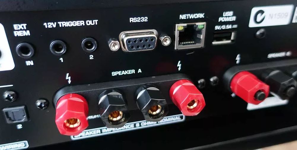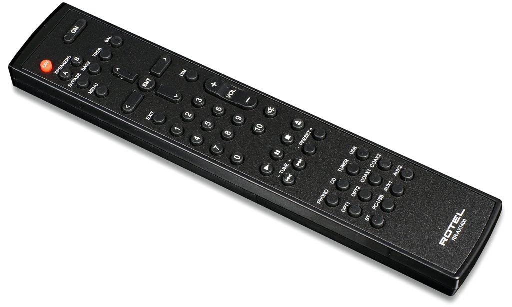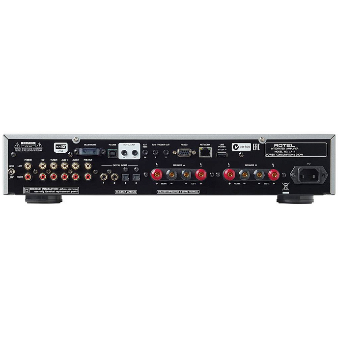 • прочая коммутация интерфейс RS-232, 2 разъема шины Rotel Link, 2 триггерных выхода, ИК-вход, USB Power (5 В/0,5А) для зарядки портативных устройств, заземляющая клемма;