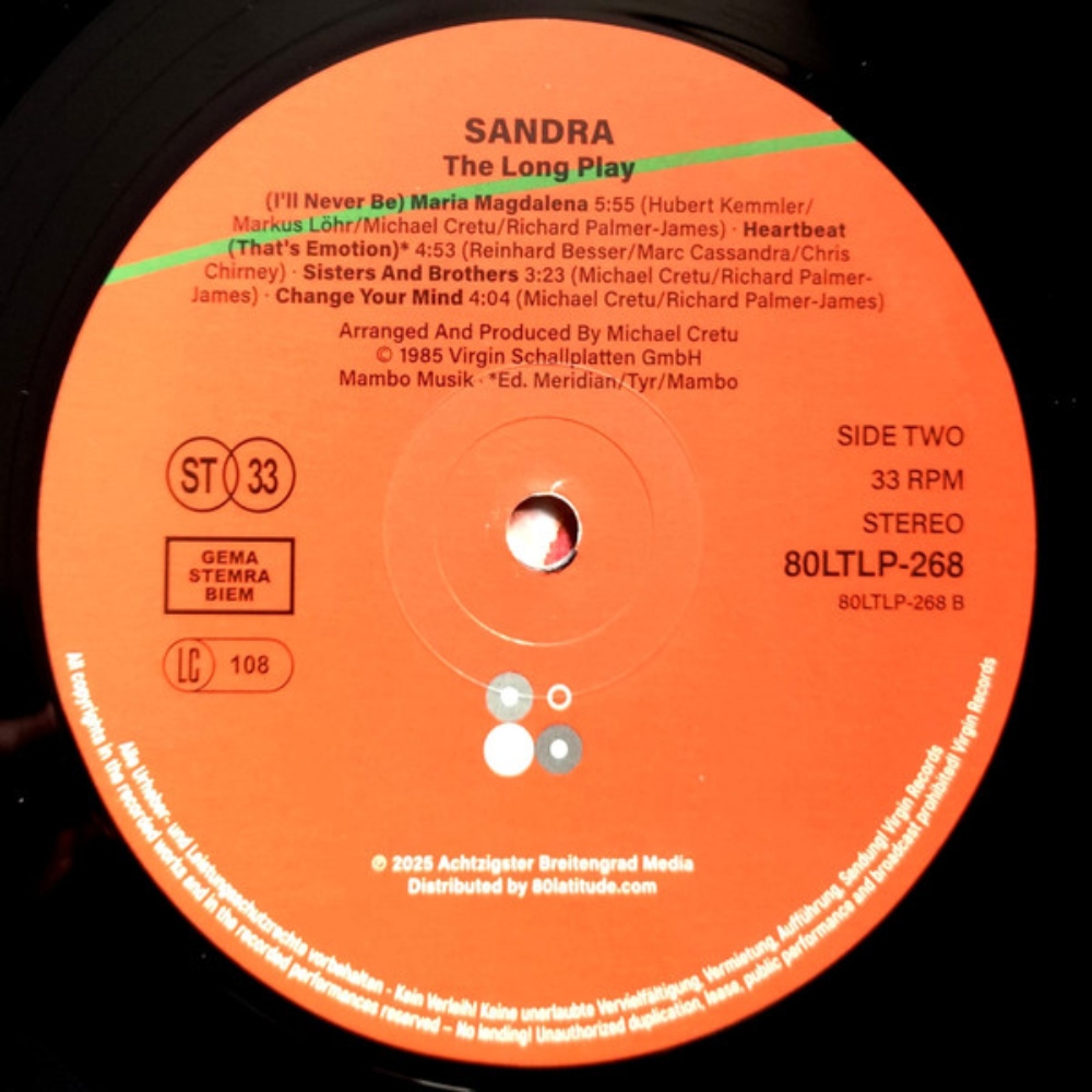 The Long Play — это квинтэссенция стиля Сандры: чувственный вокал, атмосферные синтезаторы, характерный ритм и тонкое сочетание меланхолии и энергии танцпола. Хиты с этой пластинки, включая «(I’ll Never Be) Maria Magdalena» и «In the Heat of the Night», стали неотъемлемой частью золотого фонда поп-музыки.