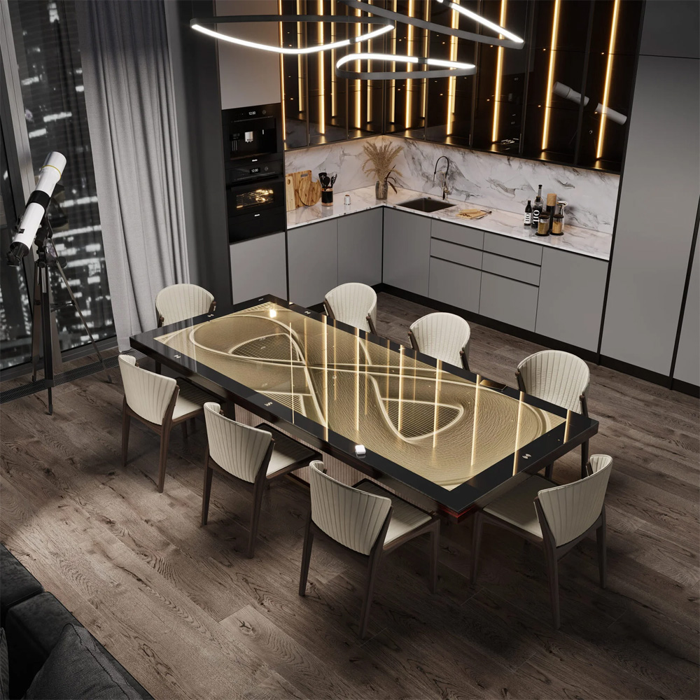 Для любителей острых ощущений, можно выбрать любой цвет подсветки через приложение на iPhone. Стол выдерживает нагрузку до 100 килограмм. Чтобы обеспечить сохранность, столешница накрыта прочным закалённым стеклом Optiwhite, что позволяет в полной мере насладиться движением металлического шара по песку. К столу добавлены модули беспроводной зарядки, чтобы заряжать телефоны, часы, наушники и т.д.