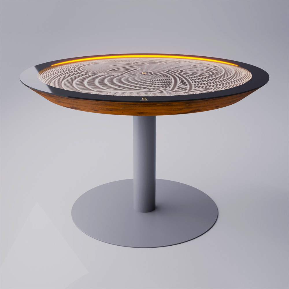 Для любителей острых ощущений, можно выбрать любой цвет подсветки через приложение на iPhone. Стол выдерживает нагрузку до 100 килограмм. Чтобы обеспечить сохранность, столешница накрыта прочным закалённым стеклом Optiwhite, что позволяет в полной мере насладиться движением металлического шара по песку. К столу добавлены модули беспроводной зарядки, чтобы заряжать телефоны, часы, наушники и т.д.