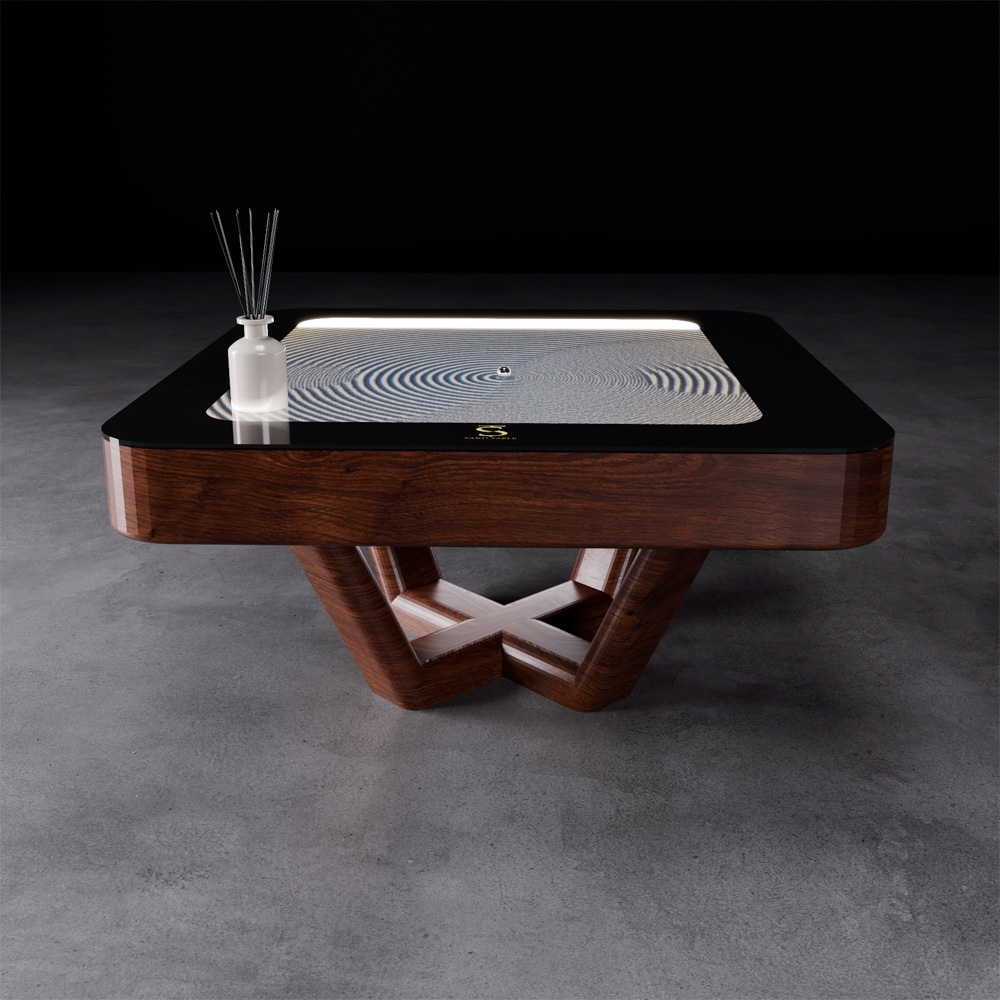 Для любителей острых ощущений, можно выбрать любой цвет подсветки через приложение на iPhone. Стол выдерживает нагрузку до 100 килограмм. Чтобы обеспечить сохранность, столешница накрыта прочным закалённым стеклом Optiwhite, что позволяет в полной мере насладиться движением металлического шара по песку. К столу добавлены модули беспроводной зарядки, чтобы заряжать телефоны, часы, наушники и т.д.