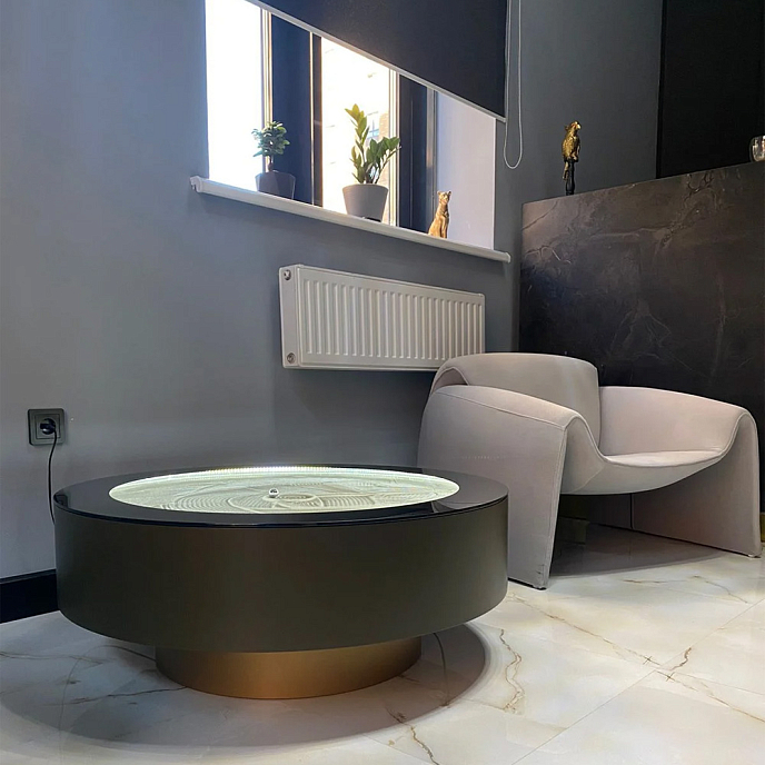 Для любителей острых ощущений, можно выбрать любой цвет подсветки через приложение на iPhone. Стол выдерживает нагрузку до 100 килограмм. Чтобы обеспечить сохранность, столешница накрыта прочным закалённым стеклом Optiwhite, что позволяет в полной мере насладиться движением металлического шара по песку. К столу добавлены модули беспроводной зарядки, чтобы заряжать телефоны, часы, наушники и т.д.