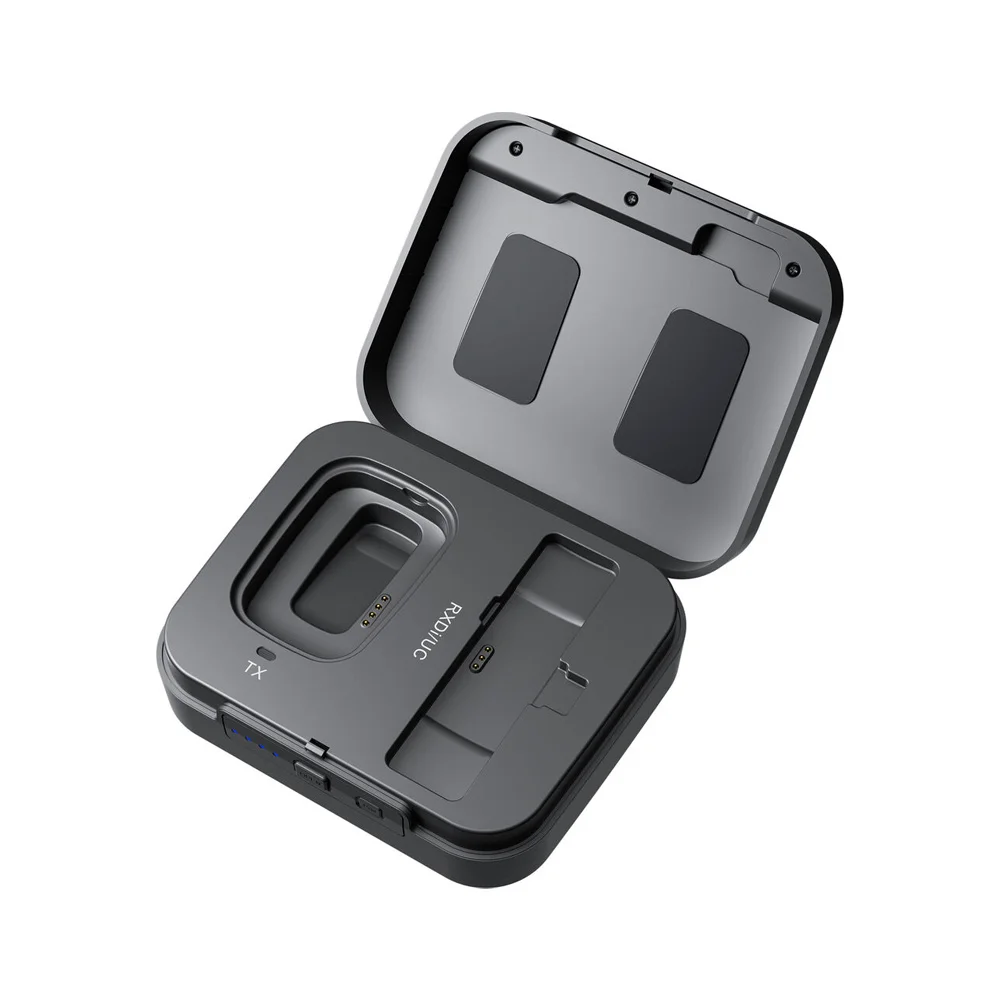 Создатели также продумали процесс зарядки: вместо того, чтобы отдельно заряжать приемник и передатчики, вы можете положить их все в штатный кейс и заряжать от встроенного аккумулятора кейса – как с беспроводными наушниками. Встроенного аккумулятора кейса хватает на 2-3 зарядки всего комплекта, заряжается он через USB-C порт. Передатчик также можно подключить к отдельному источнику питания: для этого сбоку у него расположен разъем USB micro B – это может пригодиться в случае длительной работы, когда на перезарядку нет времени.