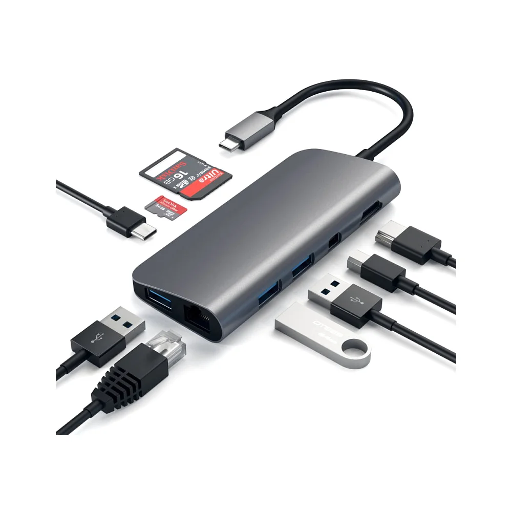 Адаптер Satechi Aluminum USB-C Multimedia Adapter добавляет множество подключений к вашему ноутбуку или настольному компьютеру, просто используя один порт USB-C.