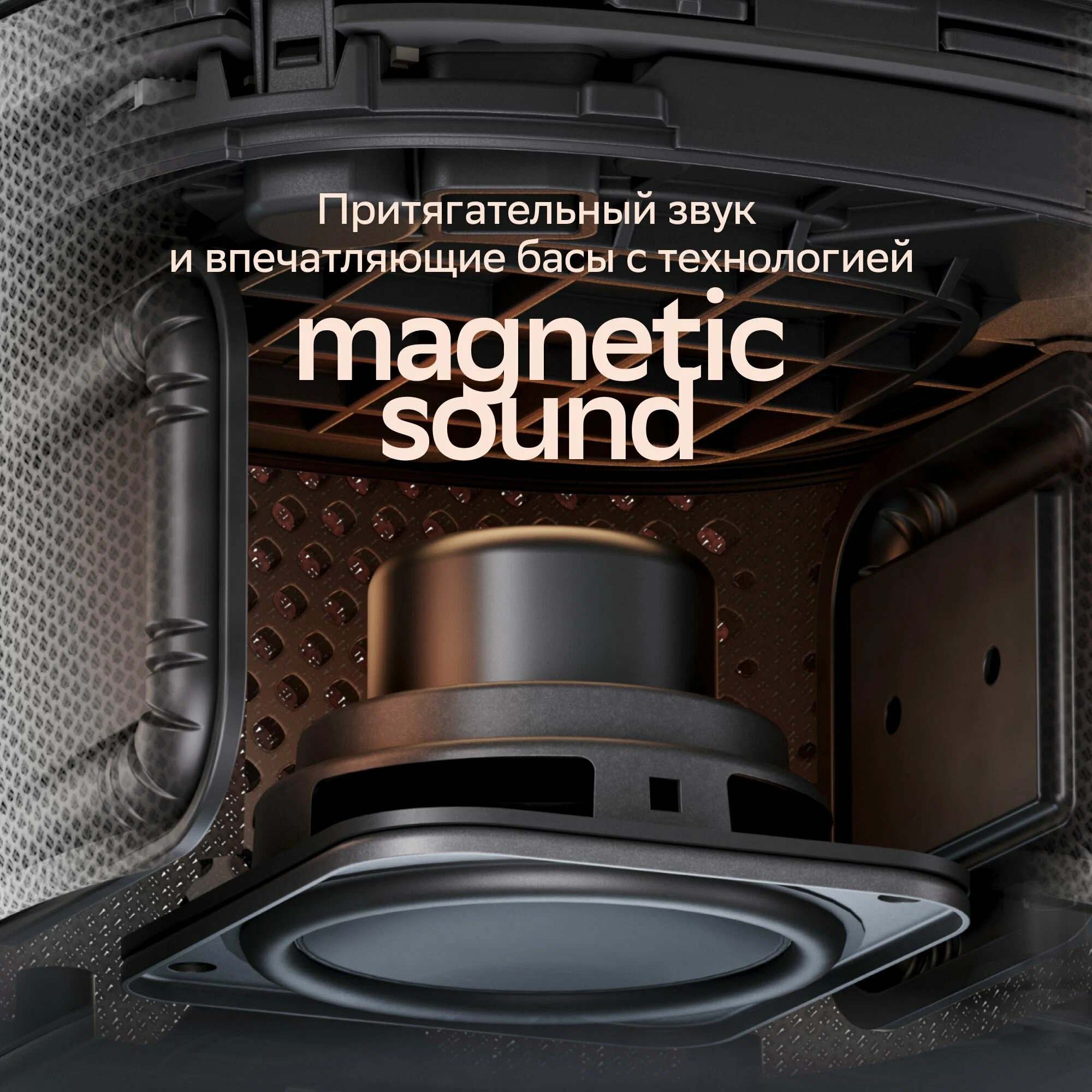 Magnetic Sound – уникальная технология, разработанная для акустики Sber. Целый комплекс инженерных и программных решений, с которыми даже колонки небольшого размера выдают отличный звук: насыщенный, чистый, с глубокими басами. «Сердце» девайса – динамик с неодимовым магнитом. Именно он обеспечивает высокую мощность при компактных размерах. Он позволяет увеличить полезный объём акустической камеры и добиться чёткого и сбалансированного звука. Программно-аппаратный комплекс отвечает за чистоту звука и исключает практически любые искажения.