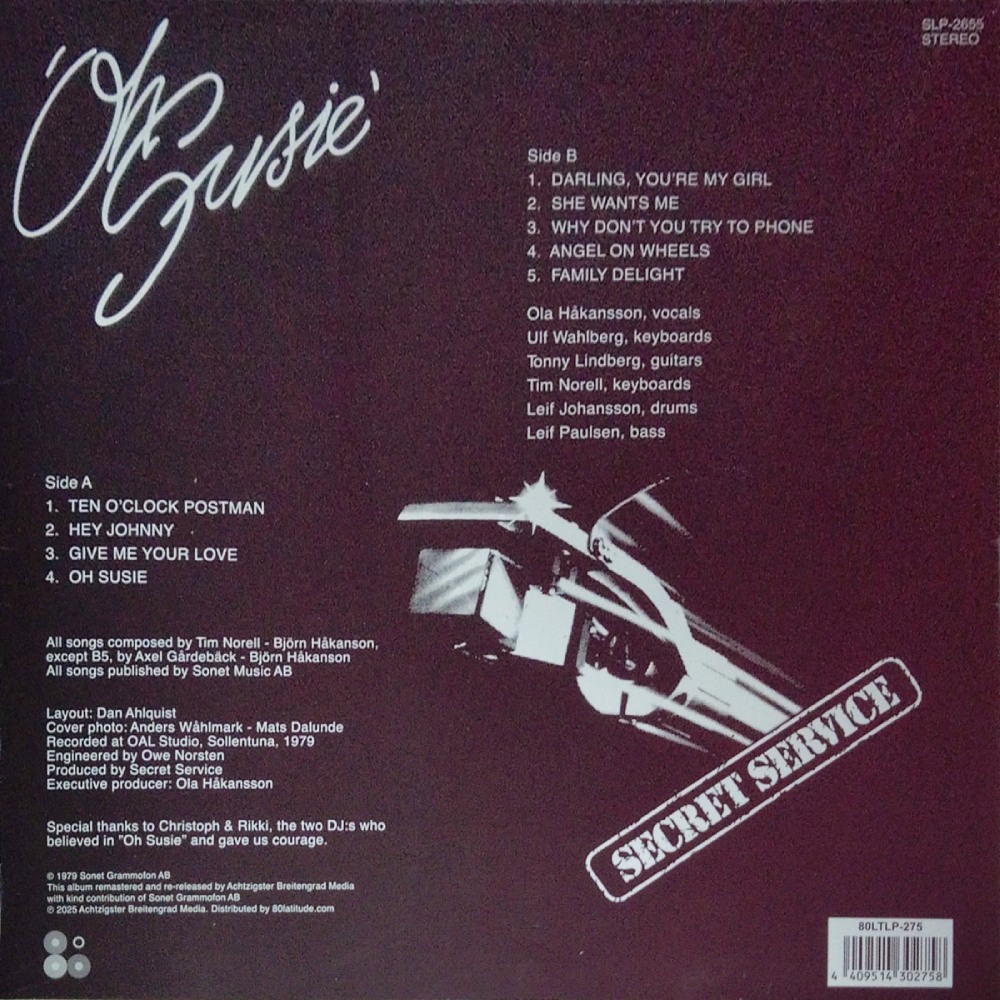 Дебютный студийный альбом шведской поп-группы Secret Service, Oh Susie, впервые увидел свет в 1979 году и с тех пор занял важное место в истории европейской поп-музыки. Записанный на легендарной студии OAL Studio в Соллентуне, пригороде Стокгольма, альбом демонстрирует неповторимое сочетание мелодичного синти-попа и классического поп-звучания конца 70-х. Продюсированная самой группой, запись отличается яркой энергетикой и свежестью, которые до сих пор завораживают слушателей.