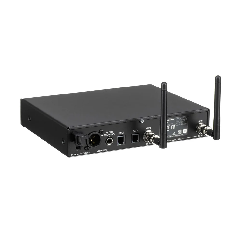 Приемник EM 100 G4 представлен в полурэковом корпусе, что позволяет ему не отнимать много места в рэковой стойке: пара таких приборов будет располагаться как один корпус стандарта 1U. На задней части устройства располагаются две съемные антенны, с помощью которых достигается высокая точность приема сигнала и столь широкая рабочая зона. Входы для антенн сделаны на разъемах BNC. Гибкость в настройке обеспечивают 20 совместимых каналов, полоса пропускания 42 МГц и функция шумоподавления с тремя режимами – низкий, средний и высокий.