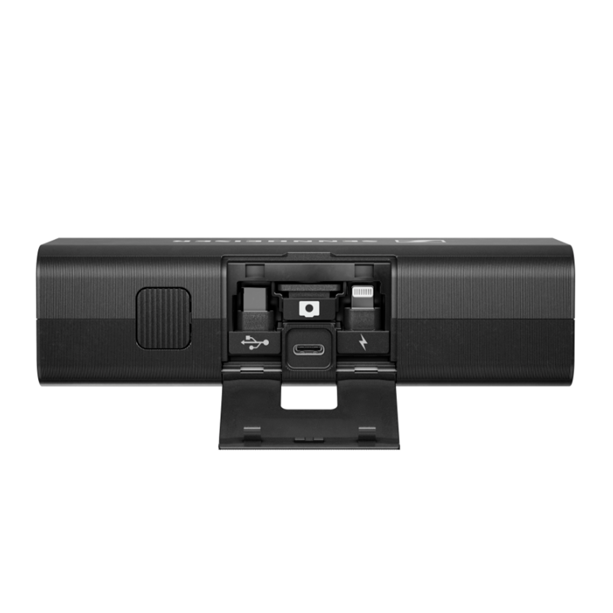 Все элементы системы хранятся в зарядной панели, которая также может выступать в качестве корпуса при использовании Sennheiser Profile Wireless в качестве ручного микрофона. Вот так она выглядит при использовании в таком сценарии: